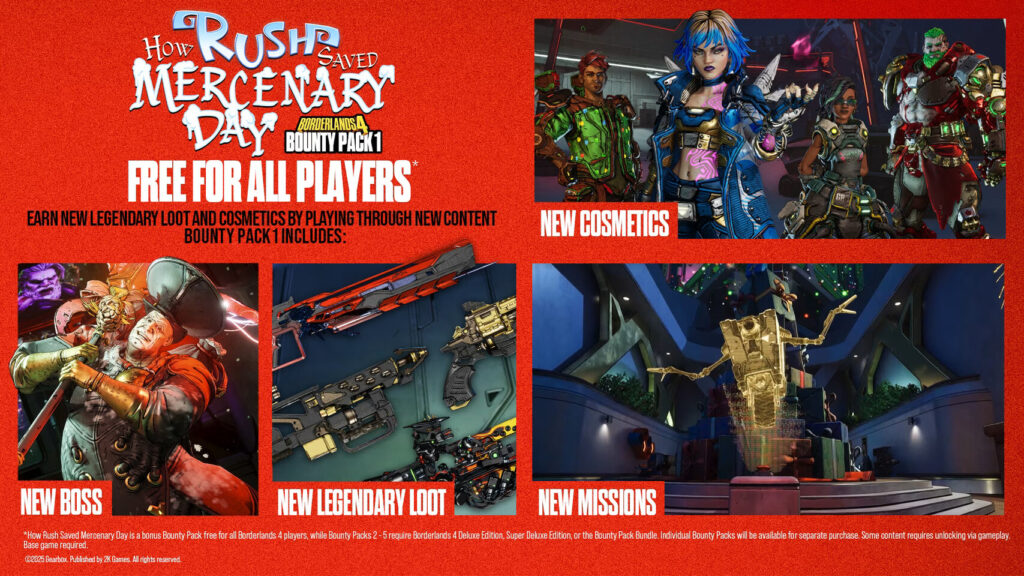 Per compensare, Gearbox e 2K hanno deciso di rendere Borderlands 4 – Bounty Pack 1: How Rush Saved Mercenary Day un DLC gratuito per tutti i giocatori a partire dal 20 novembre. Il pacchetto introduce una nuova questline dedicata a Rush, leader degli Oubounders, e ispirata a un’atmosfera natalizia in chiave sci-fi, con l’obiettivo di far rivivere al personaggio ricordi d’infanzia e lo spirito delle festività.