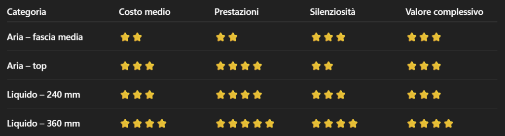 In generale, i dissipatori ad aria di fascia media offrono un ottimo equilibrio per uso mainstream, mentre gli AIO di dimensioni maggiori brillano nelle prestazioni pure.