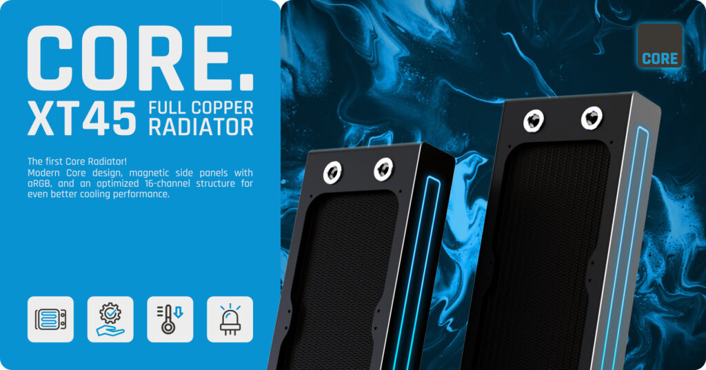 I radiatori Core XT45 combinano la comprovata struttura interamente in rame di Alphacool con un design completamente rinnovato. Il look pulito e moderno può essere personalizzato grazie a pannelli laterali intercambiabili, disponibili in versione con illuminazione aRGB integrata o classica senza illuminazione. Il sistema di fissaggio magnetico consente di sostituire i pannelli rapidamente e senza l’uso di attrezzi.
