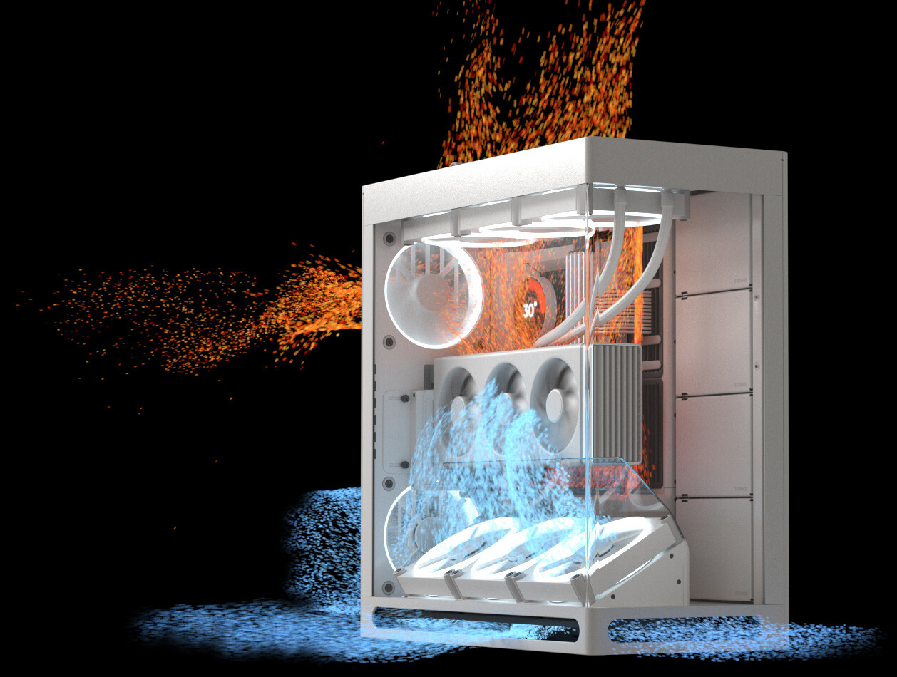 - Ventilazione personalizzata ottimizzata per il flusso d’aria, ideale per ventole da 140 mm (11 slot per ventole in totale) e radiatori fino a 420 mm su parte superiore, inferiore e laterale.