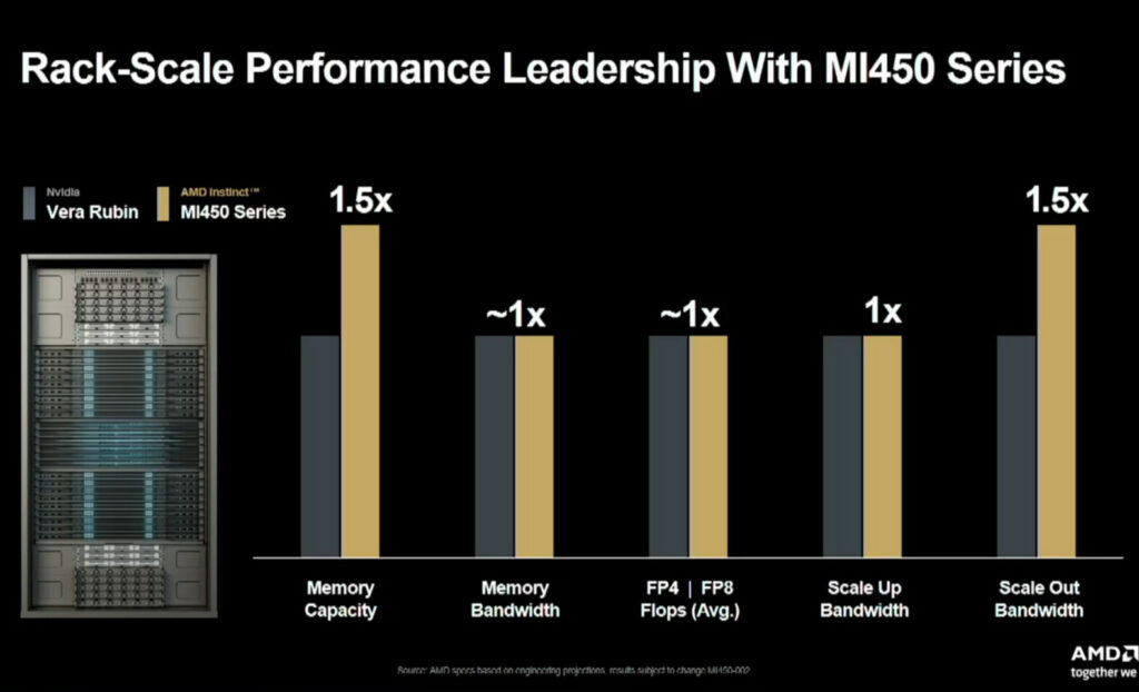 AMD posiziona la serie MI400 come diretta rivale della prossima NVIDIA Vera Rubin, sostenendo prestazioni di calcolo e larghezza di banda comparabili, ma con capacità di memoria e banda di interconnessione 1,5 volte superiori.