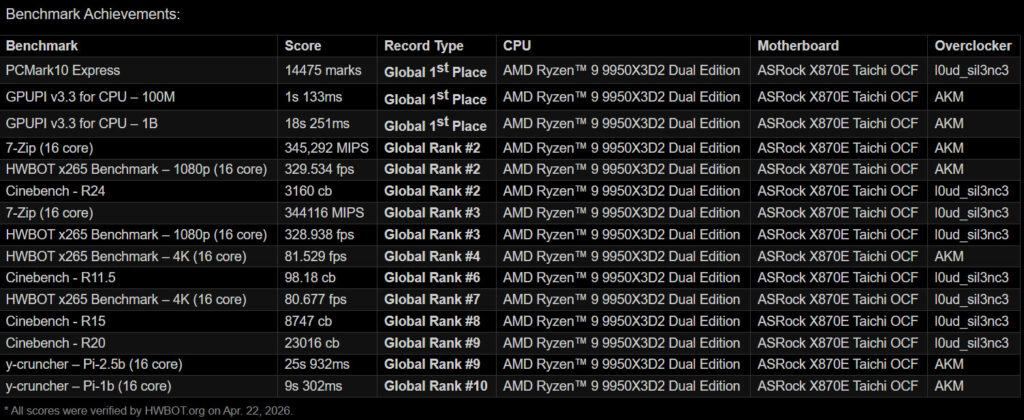 Con la combinazione della ASRock X870E Taichi OCF e del AMD Ryzen 9 9950X3D2 Dual Edition, ASRock ridefinisce ancora una volta gli standard dell’overclocking estremo. I risultati ottenuti nei benchmark globali dimostrano come l’hardware di nuova generazione sia in grado di superare limiti precedentemente considerati invalicabili.