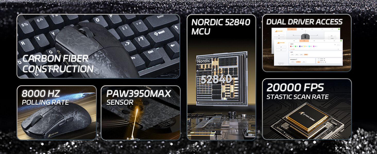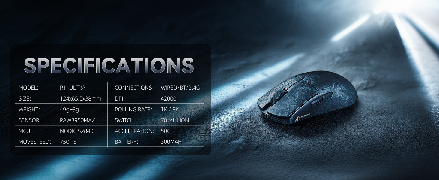 Il R11 ULTRA è equipaggiato con il sensore ottico PixArt PAW3950MAX, capace di raggiungere 42.000 DPI, 750 IPS e 50G di accelerazione. Il chip Nordic 52840 garantisce una connessione wireless stabile e priva di lag, mentre il polling rate di 8.000 Hz e la frequenza di scansione di 20.000 FPS assicurano una risposta immediata, catturando ogni movimento con precisione millimetrica.