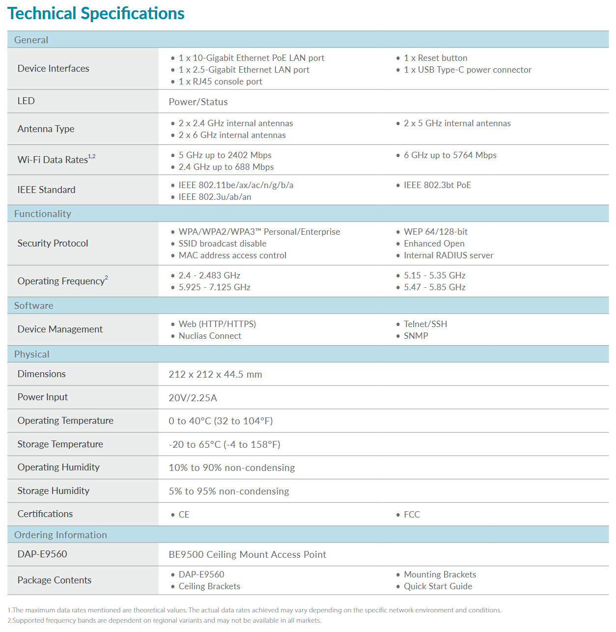 Il DAP-E9560 supporta la più recente tecnologia Wi-Fi 7 (802.11be) con operatività tri-band (2,4 GHz / 5 GHz / 6 GHz) e canali fino a 320 MHz, garantendo throughput multi-gigabit e maggiore efficienza spettrale.