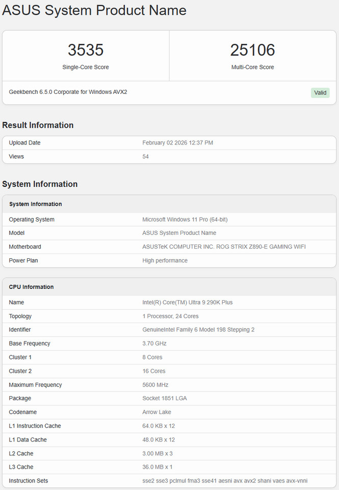 Il modello Core Ultra 9 290K Plus è stato testato su una scheda madre ASUS ROG Strix Z890-E Gaming Wi-Fi con 64 GB di memoria DDR5-6800, ottenendo 3.535 punti in single-core e 25.106 punti in multicore su Geekbench.