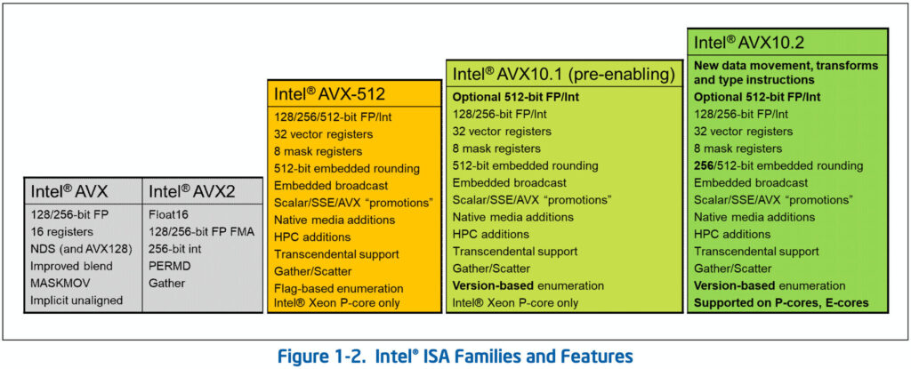 Il supporto ad AVX10.2 implica che sia i core Performance “Coyote Cove” che gli Efficient “Arctic Wolf” della serie Nova Lake saranno in grado di eseguire istruzioni AVX-512, permettendo una notevole accelerazione dei calcoli vettoriali.