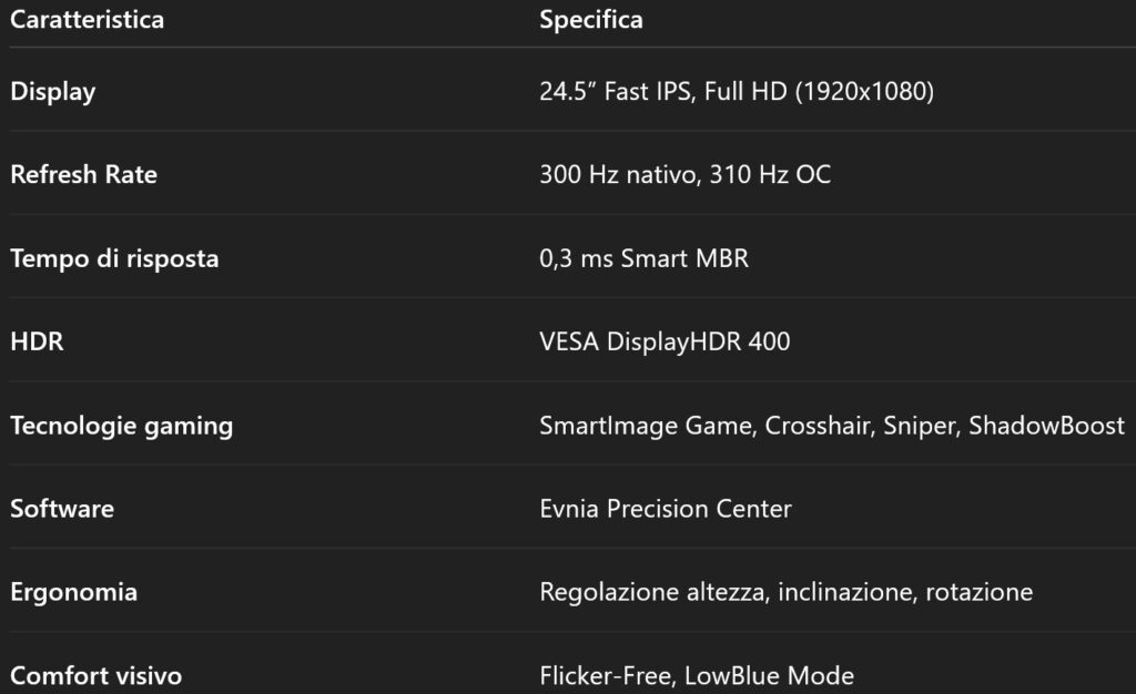 Il cuore del Philips Evnia 25M2N3200U è un pannello Fast IPS da 24,5″ Full HD (1920×1080), capace di offrire una frequenza nativa di 300 Hz, overclockabile a 310 Hz, accompagnata da un tempo di risposta ridottissimo di 0,3 ms Smart MBR (Motion Blur Reduction). Queste specifiche lo posizionano tra i monitor più veloci della sua categoria, riducendo drasticamente lag, tearing e motion blur.