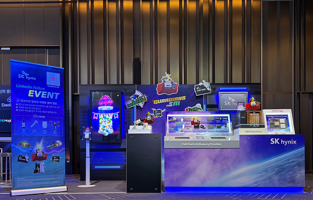 Sotto il claim “Guardians of the AI – Full-Stack AI Memory Provider”, lo stand di SK hynix ha messo in mostra l’intera gamma di prodotti dedicati alle infrastrutture AI, utilizzando personaggi grafici e un linguaggio visivo accessibile per presentare tecnologie ad alta complessità in modo coinvolgente.