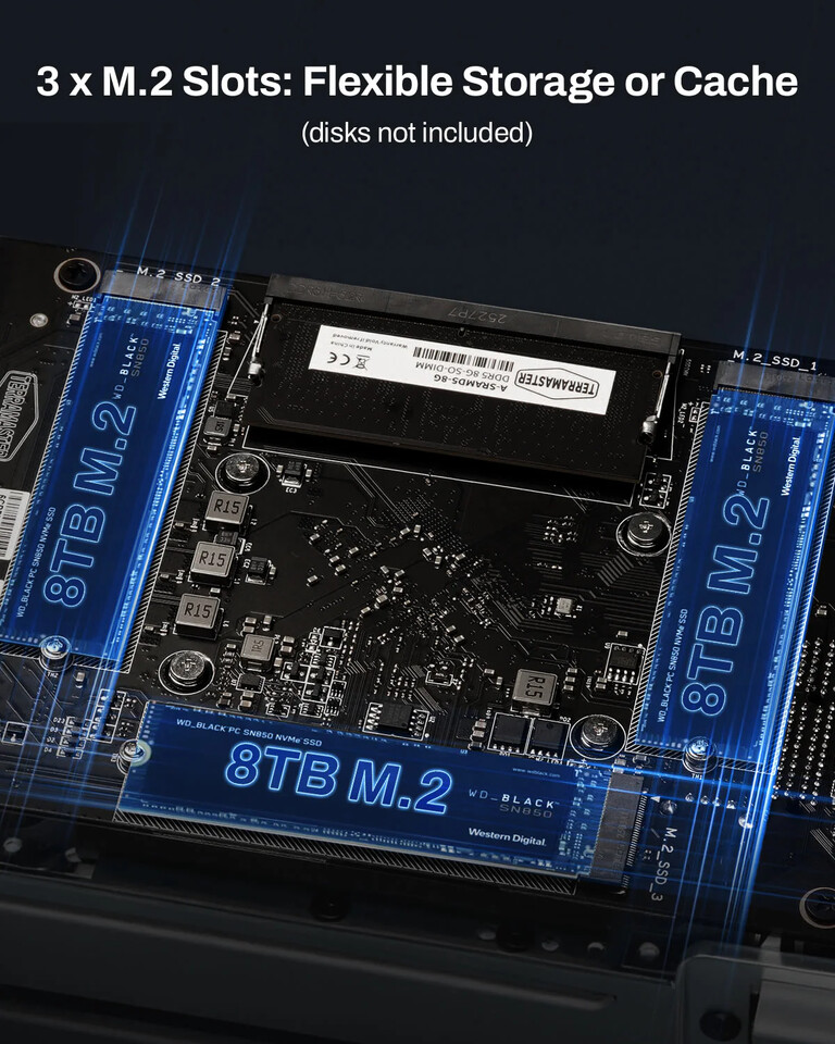 Le unità supportano SSD M.2 fino a 8 TB ciascuno, utilizzabili come cache o volumi indipendenti. Grazie alla tecnologia proprietaria TRAID, le prestazioni di lettura/scrittura migliorano del 30%, con maggiore ridondanza e sicurezza. Ogni HDD può raggiungere i 30 TB, con possibilità di espansione via array USB esterni per una scalabilità virtualmente illimitata.