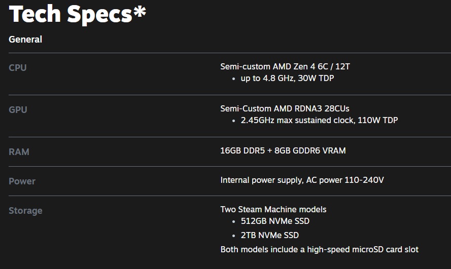 La nuova Steam Machine adotta un processore AMD Zen 6C a 6 core e una GPU RDNA 3 personalizzata con 28 Compute Unit, accompagnati da 16 GB di memoria DDR5 e 8 GB dedicati alla grafica. Valve dichiara prestazioni fino a sei volte superiori rispetto allo Steam Deck, con la possibilità di giocare in 4K a 60 FPS grazie al supporto AMD FSR.
