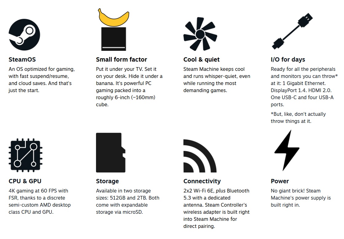 La nuova Steam Machine adotta un processore AMD Zen 6C a 6 core e una GPU RDNA 3 personalizzata con 28 Compute Unit, accompagnati da 16 GB di memoria DDR5 e 8 GB dedicati alla grafica. Valve dichiara prestazioni fino a sei volte superiori rispetto allo Steam Deck, con la possibilità di giocare in 4K a 60 FPS grazie al supporto AMD FSR.