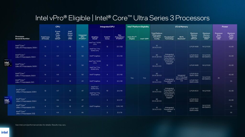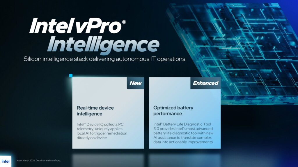 Questi nuovi chip combinano le prestazioni dei processori consumer Core Ultra Series 3 con l’intera piattaforma vPro, offrendo gestione remota, sicurezza enterprise avanzata e strumenti di amministrazione per IT.
