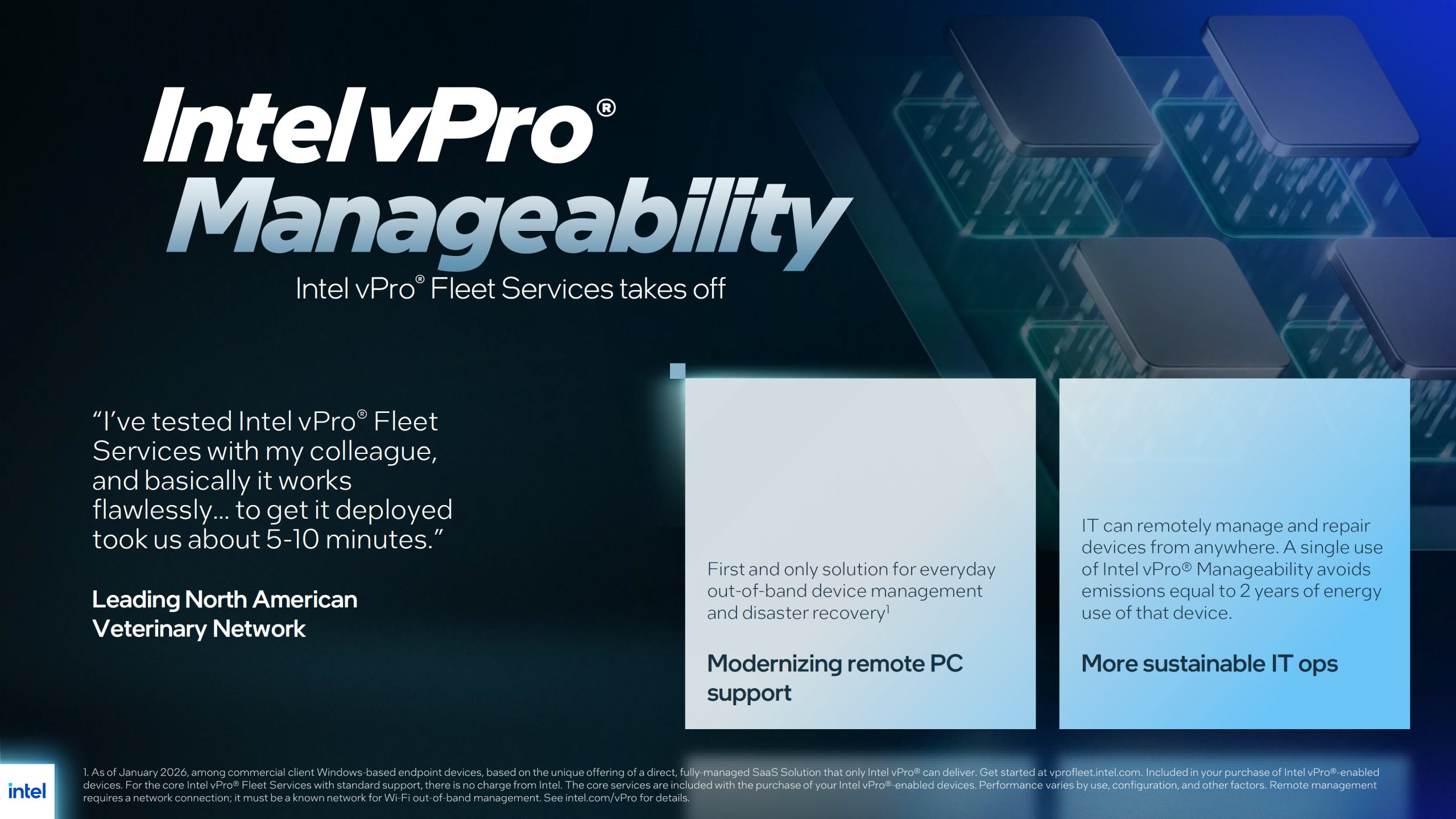 Intel introduce anche Fleet Services, una dashboard “1-click” per gestire dispositivi sul campo in maniera centralizzata.