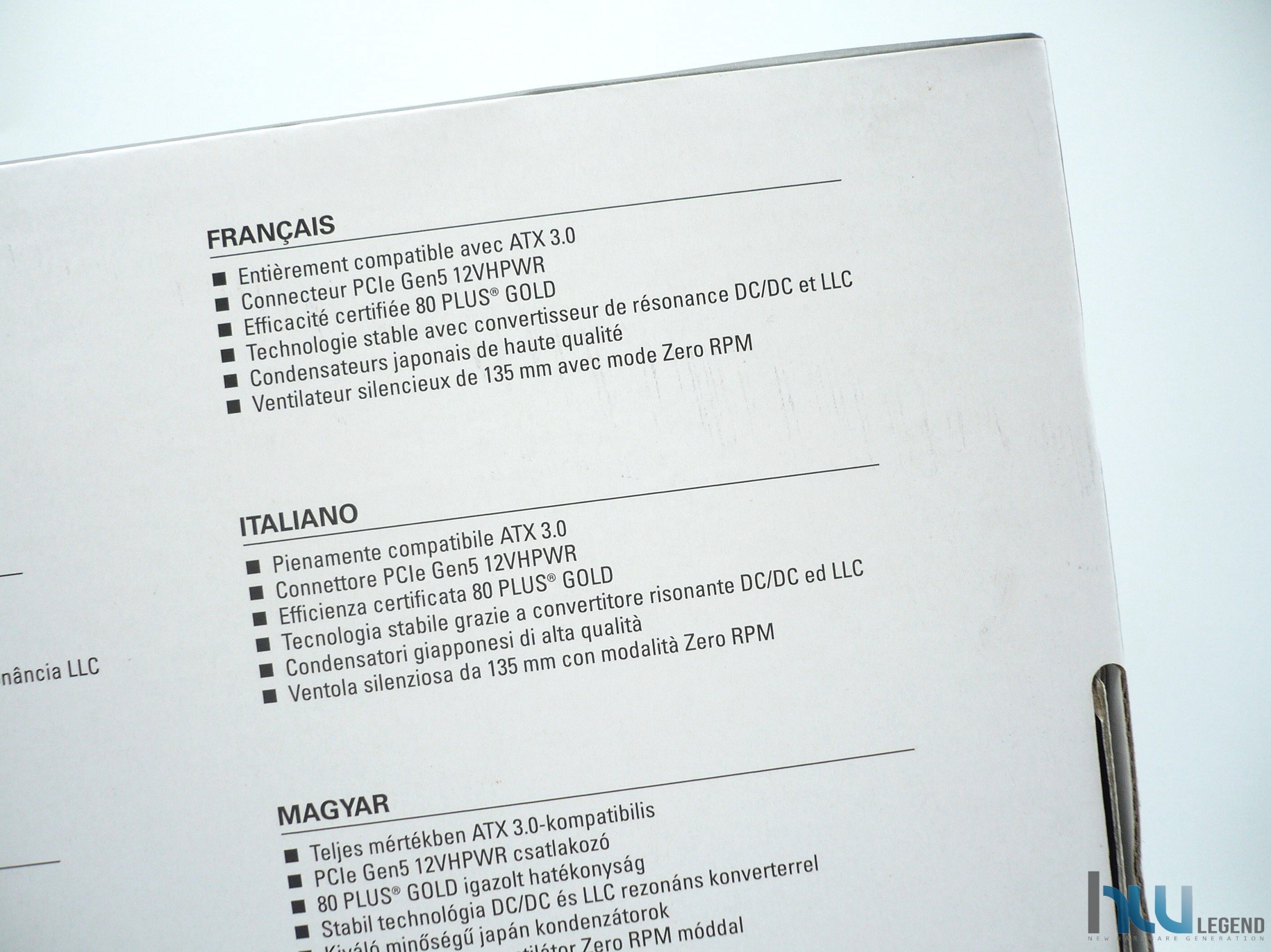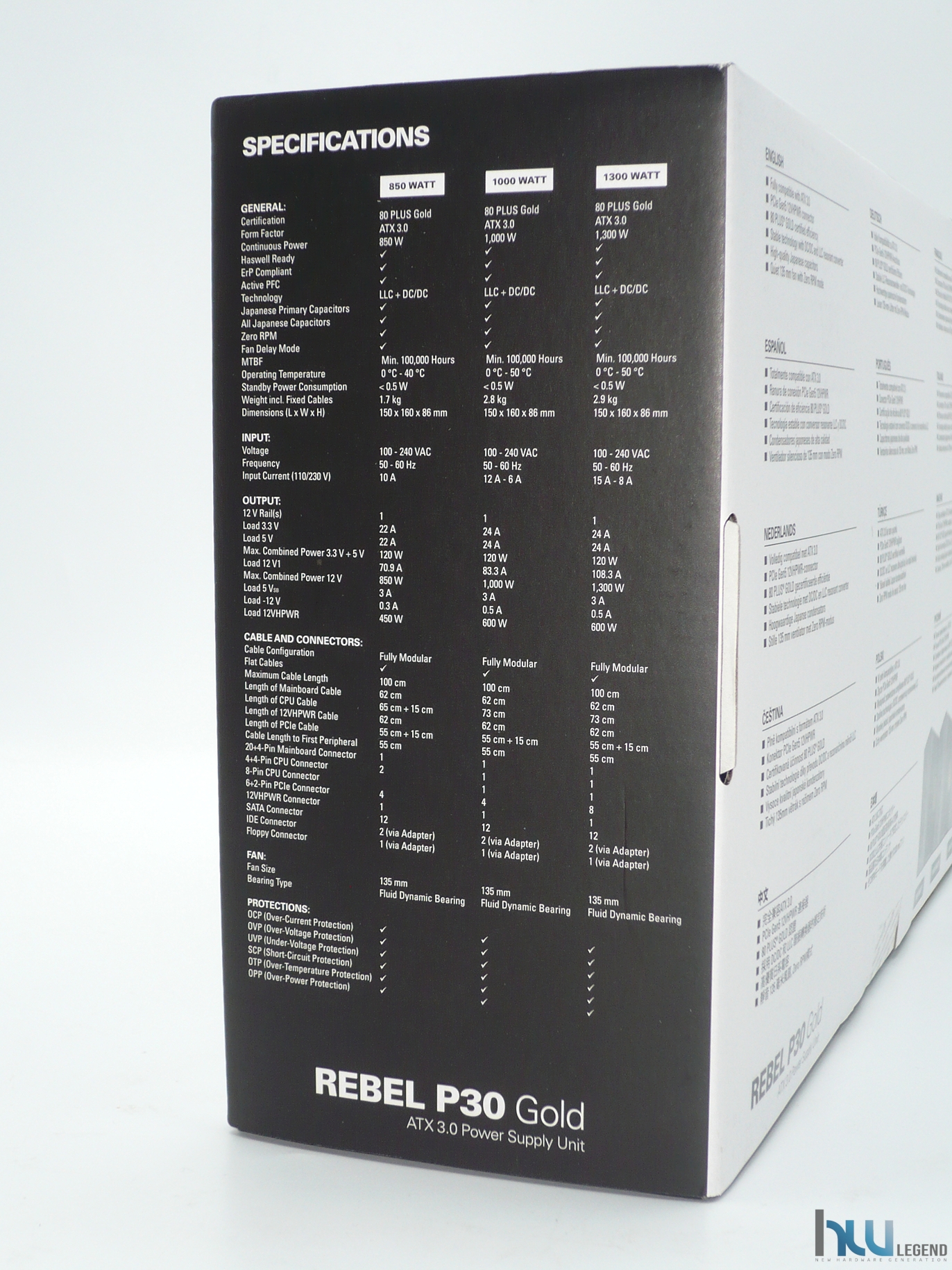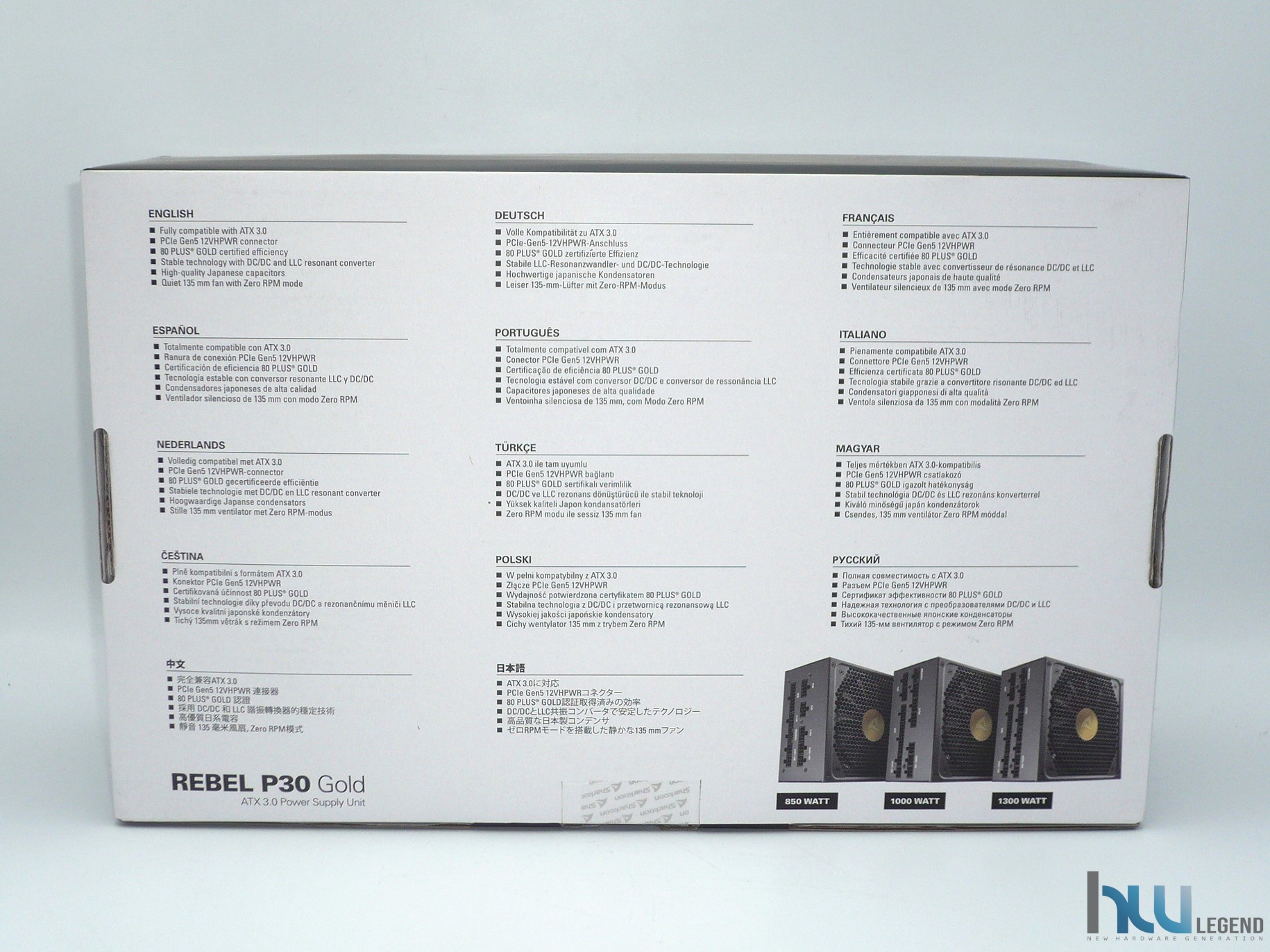 Capovolgendo la confezione possiamo osservare tutta una serie di preziose informazioni circa le principali particolarità e funzionalità esclusive previste per questo prodotto, opportunamente tradotte in varie lingue, tra cui l’italiano. In basso è presente la nomenclatura completa, affiancata da una serie di immagini raffiguranti i tre modelli che compongono la line-up, con tagli di potenza a partire da 850W fino ad arrivare a ben 1.300W reali.