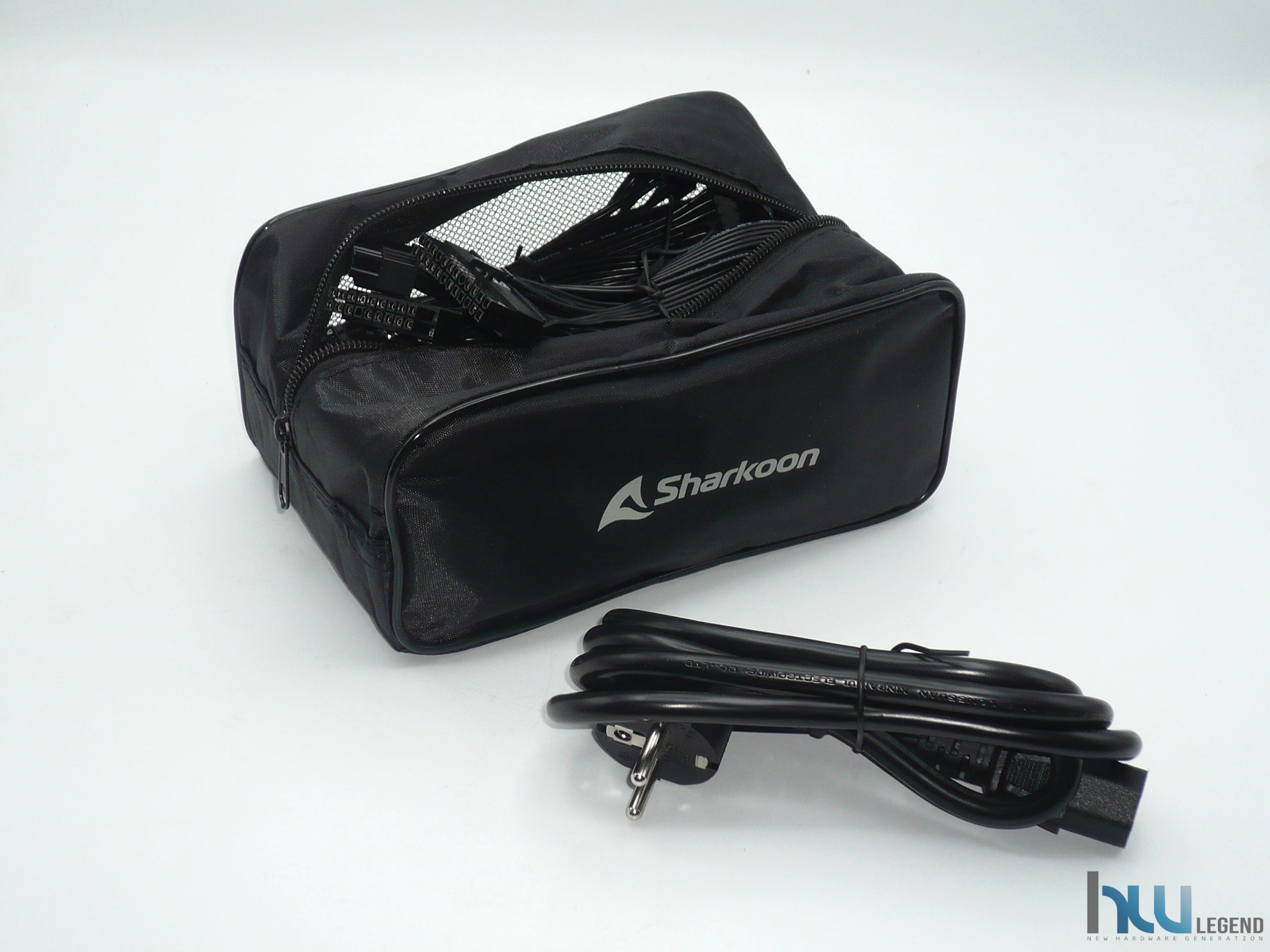 A fianco dell’alimentatore possiamo osservare una sacca in stoffa finemente lavorata, nella quale il produttore ha inserito i vari cavi di potenza per l’alimentazione della CPU, della M/B, i cavi PCIe relativi alle schede grafiche discrete, oltre che l’indispensabile cavo di alimentazione IEC-C15 con spina Schuko, tutti ben ordinati.