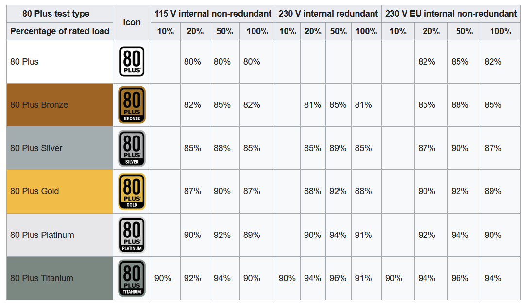 Ricordiamo che 80PLUS è un’iniziativa patrocinata da Ecos ed EPRI per promuovere l’efficienza energetica negli alimentatori dei computer. Attualmente sono sei le certificazioni vigenti, eccole riassunte nella seguente tabella: