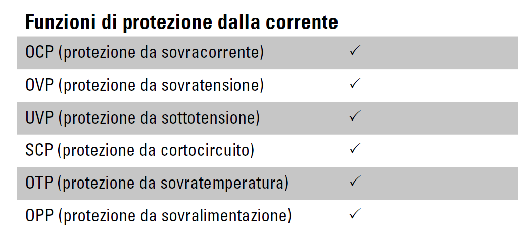 Il produttore ha implementato tutta una serie di meccanismi di protezione integrati di livello industriale, atti ad assicurare un funzionamento corretto e sicuro dell’alimentatore in ogni circostanza.
