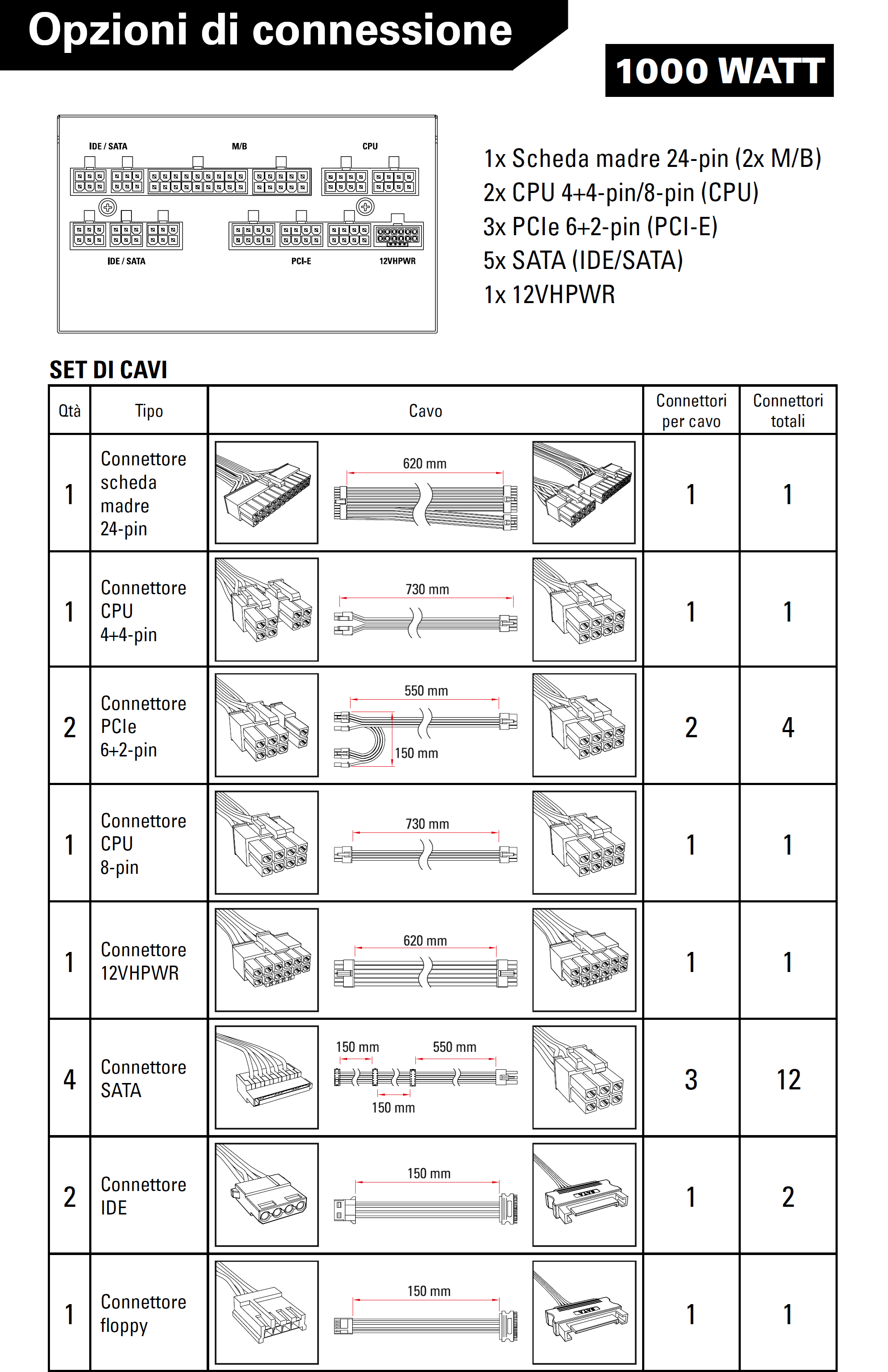 2x Cavo PCI-E 6+2 Pin (x2) della lunghezza di 550+150 millimetri (16-18AWG);