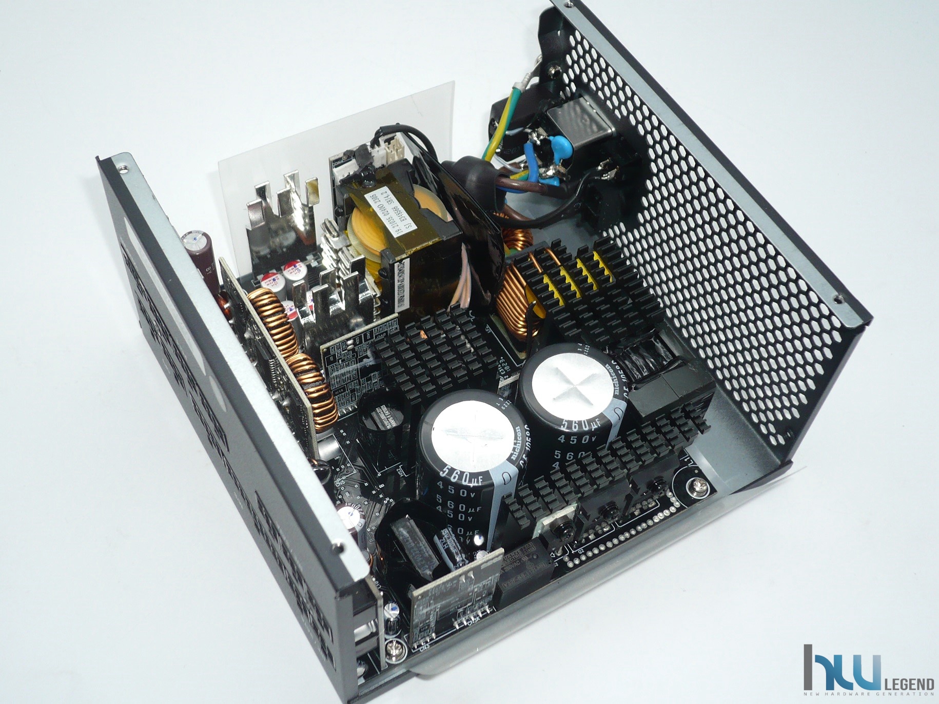 Osservando l’interno del nostro alimentatore notiamo subito una eccellente qualità costruttiva; la posizione dei componenti appare ben studiata e si nota immediatamente che quelli di potenza più ingombranti sono strategicamente disposti al fine di favorire il passaggio del flusso d’aria per il corretto raffreddamento dei componenti attivi. I dissipatori di calore sono ben dimensionati, tenendo ben presente che, grazie all’alta efficienza energetica il surriscaldamento generale è sempre molto contenuto anche in condizioni d’uso gravose.