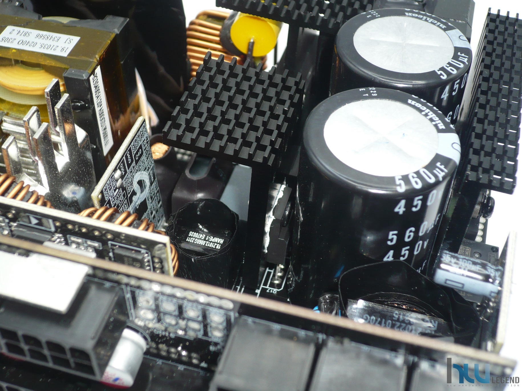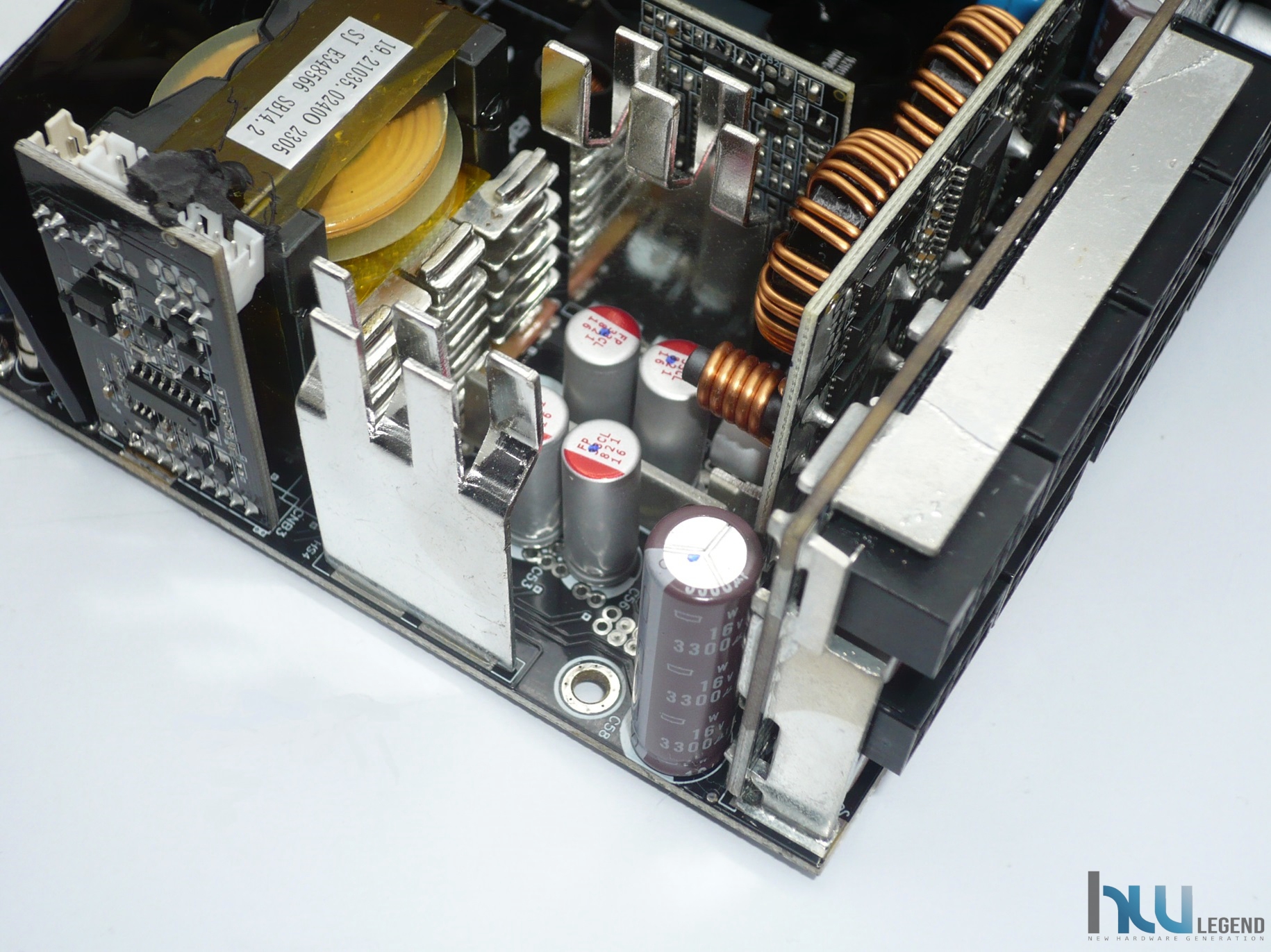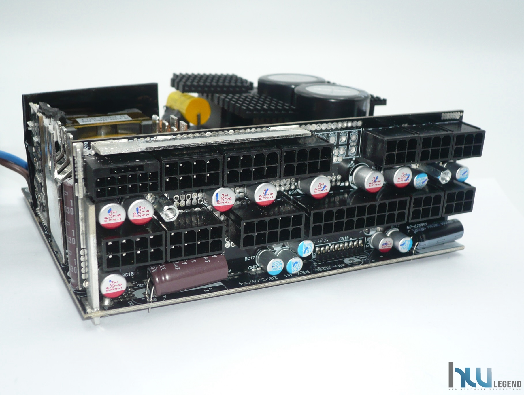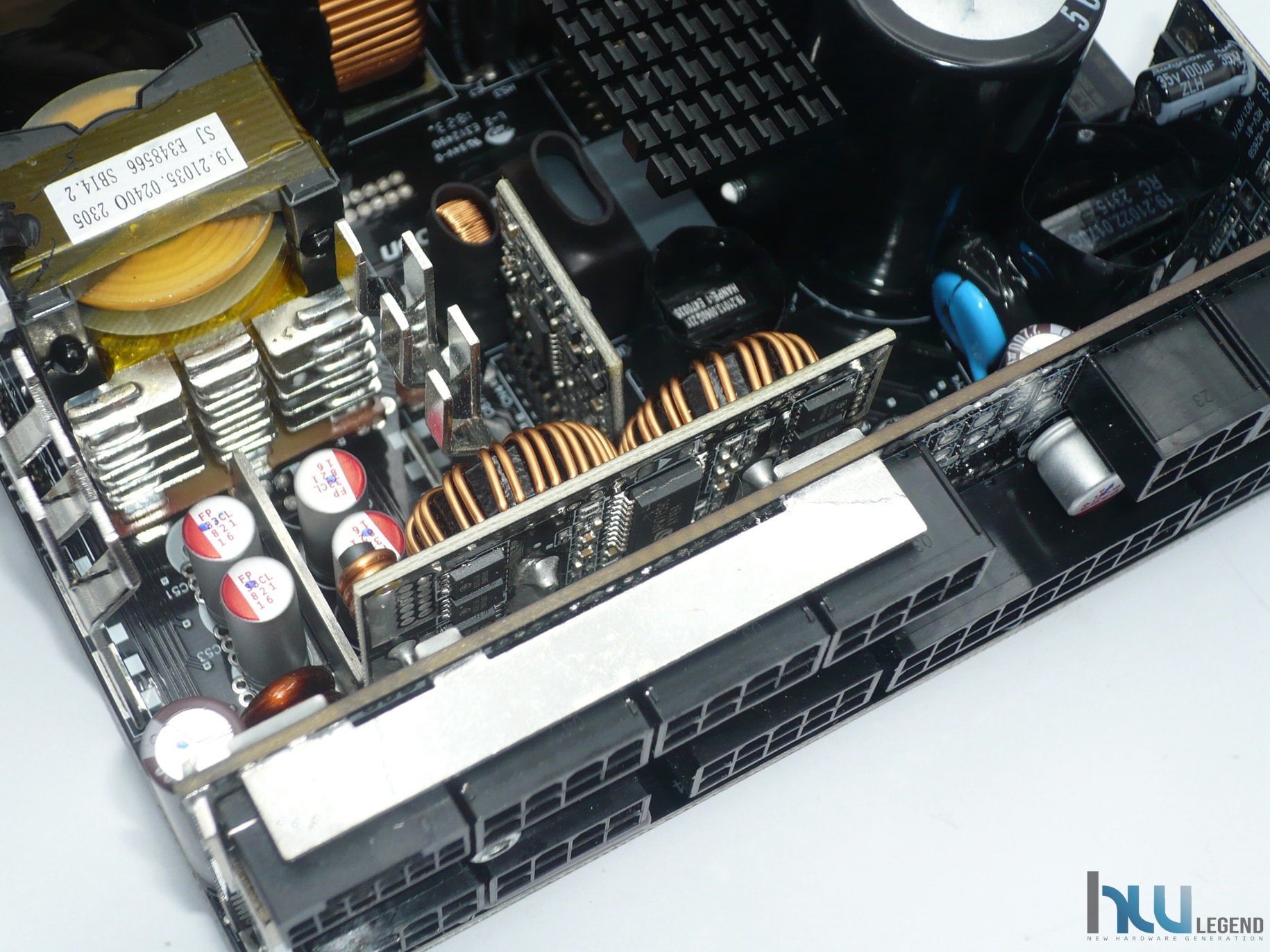 Nell’immagine che segue possiamo notare la generosa batteria di condensatori del circuito secondario, sia elettrolitici che solidi, necessari per il filtraggio e la stabilizzazione delle tensioni di uscita. La qualità è come di consueto elevata; la loro produzione è giapponese (da parte di Nippon Chemi-Con) e la temperatura di esercizio può raggiungere i 105°C. Sempre nella stessa immagine possiamo osservare una serie di guide metalliche, aventi lo scopo di veicolare la corrente verso il PCB dedicato alle varie connessioni modulari.