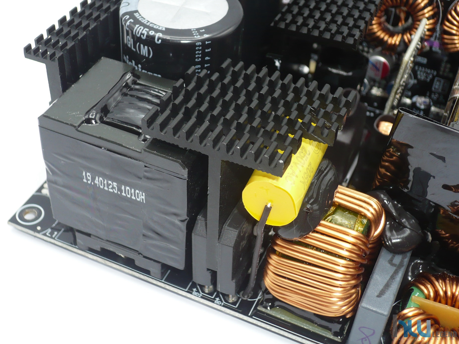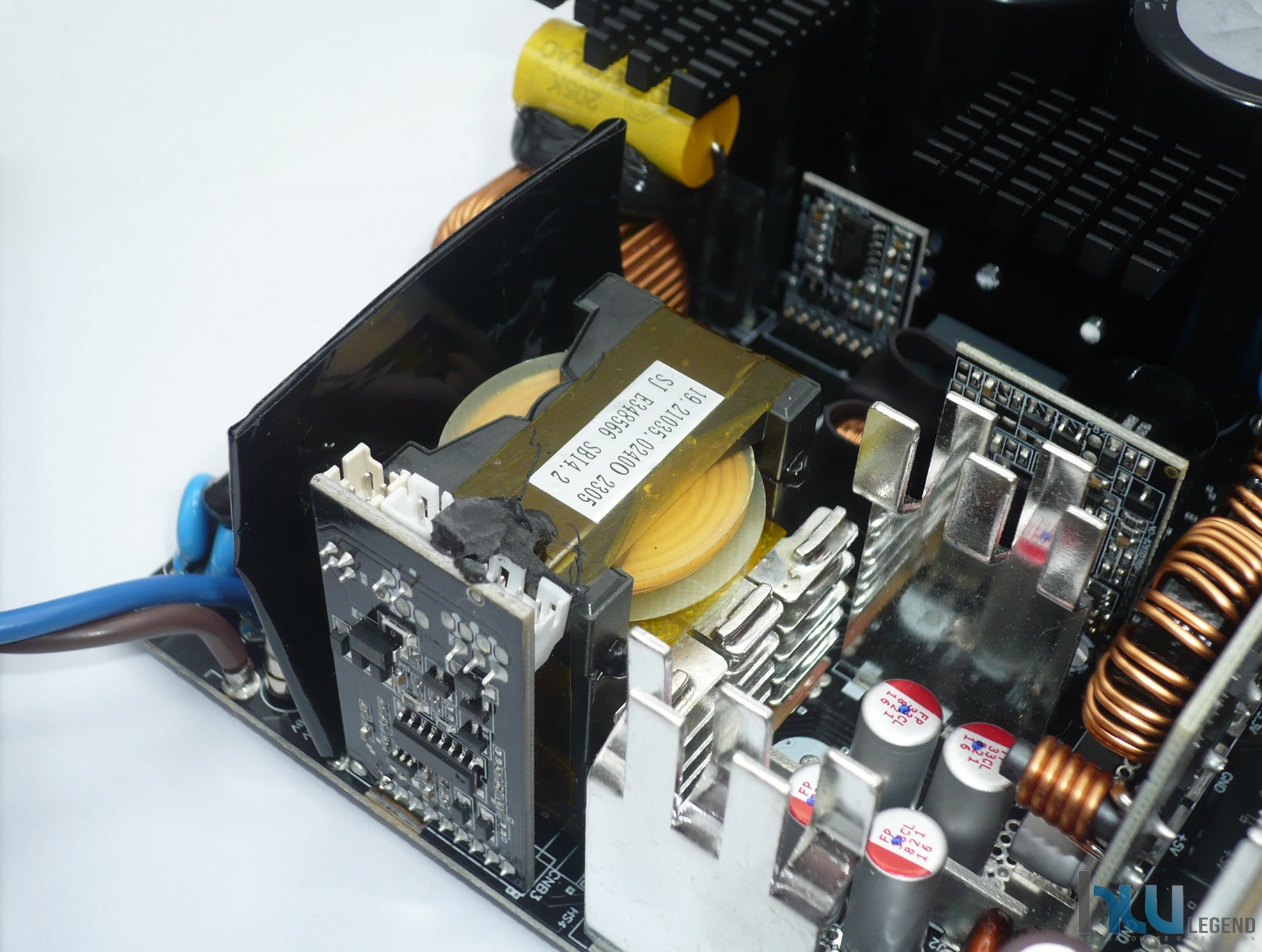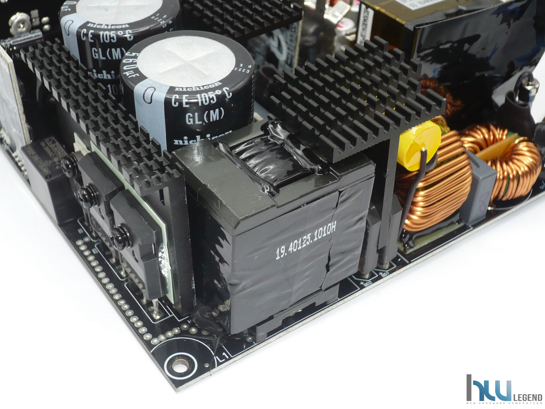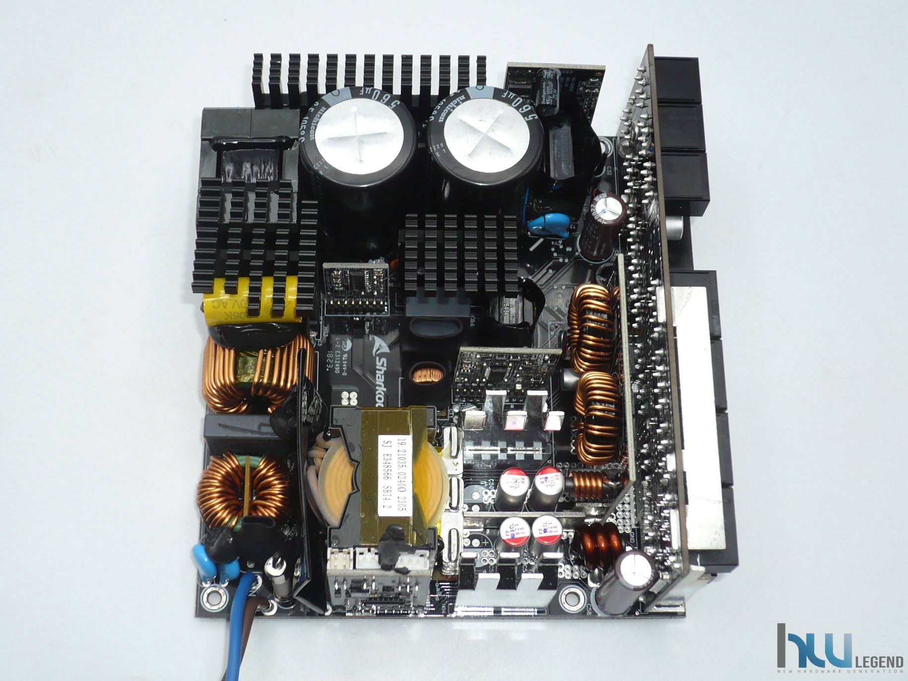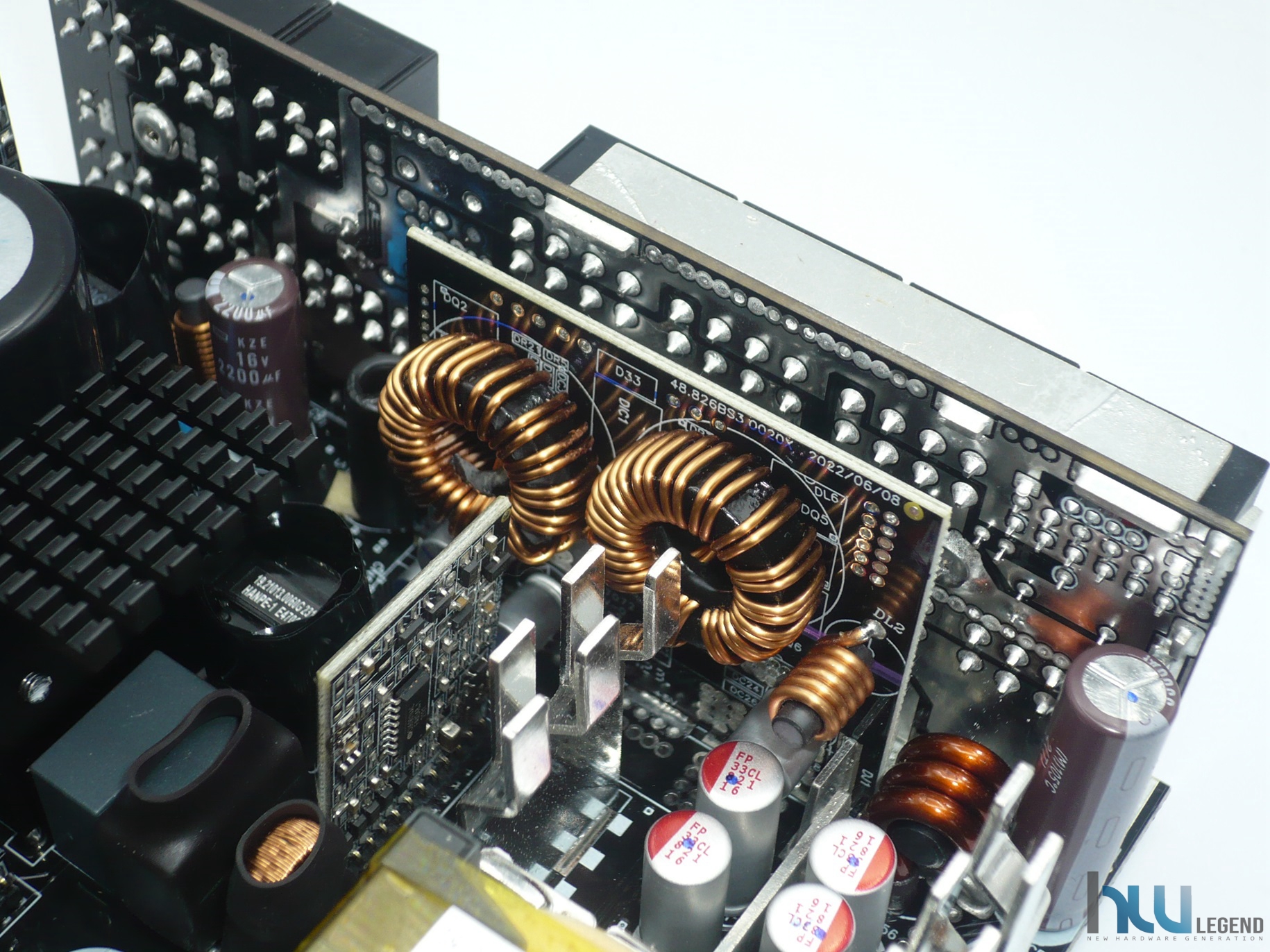 Nell’immagine che segue possiamo notare la generosa batteria di condensatori del circuito secondario, sia elettrolitici che solidi, necessari per il filtraggio e la stabilizzazione delle tensioni di uscita. La qualità è come di consueto elevata; la loro produzione è giapponese (da parte di Nippon Chemi-Con) e la temperatura di esercizio può raggiungere i 105°C. Sempre nella stessa immagine possiamo osservare una serie di guide metalliche, aventi lo scopo di veicolare la corrente verso il PCB dedicato alle varie connessioni modulari.