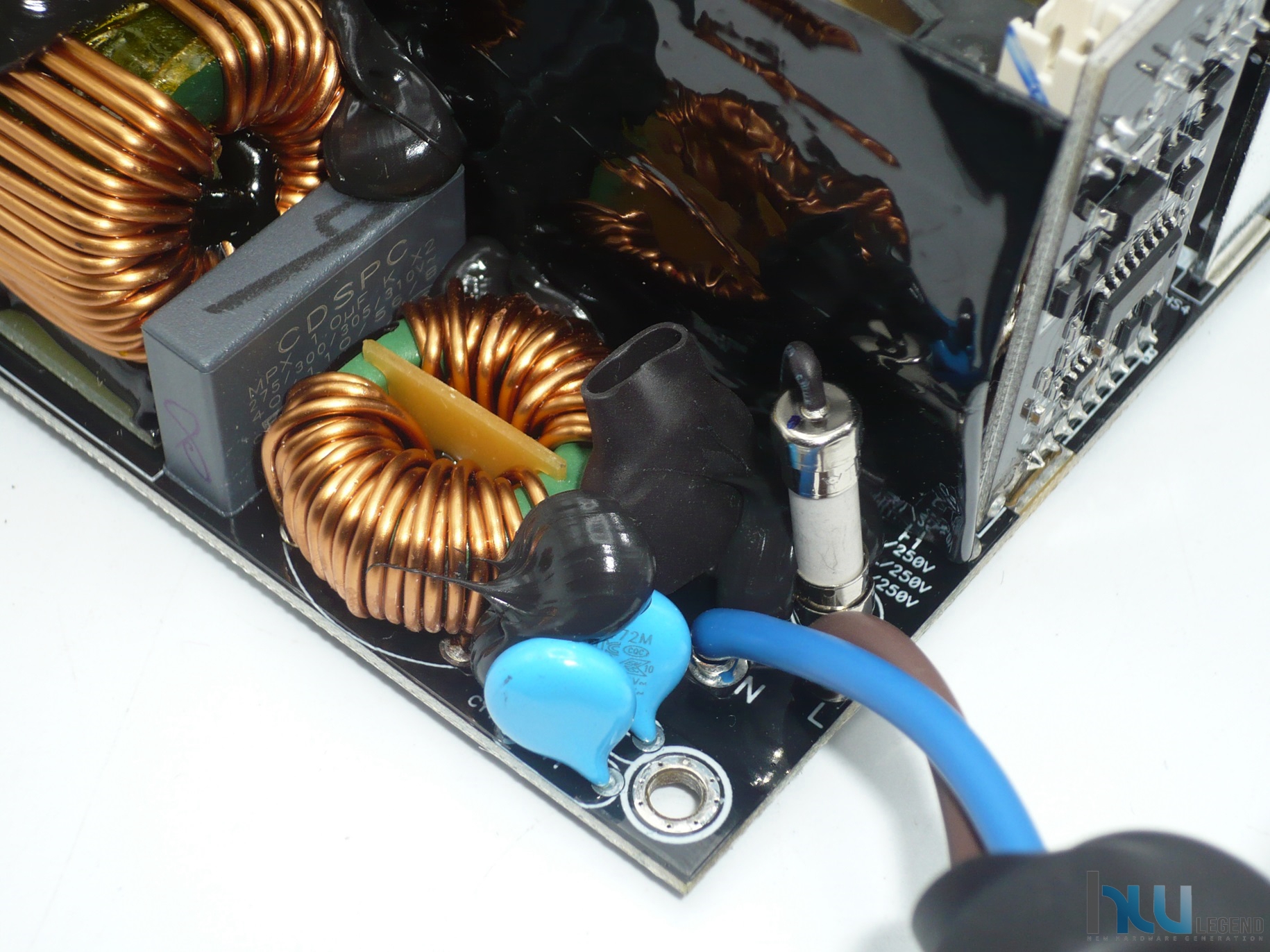 Immediatamente all’ingresso dell’alimentatore nel blocco presa/interruttore troviamo, come di consueto, un circuito di filtraggio delle interferenze elettromagnetiche (EMI), opportunamente schermato da una protezione in alluminio, necessario per attenuare le componenti di disturbo che ogni dispositivo elettronico tende ad emettere e potenzialmente riversare sulla rete, e allo stesso tempo impedire che eventuali disturbi provenienti dalla rete elettrica stessa raggiungano gli stadi successivi dell’unità.