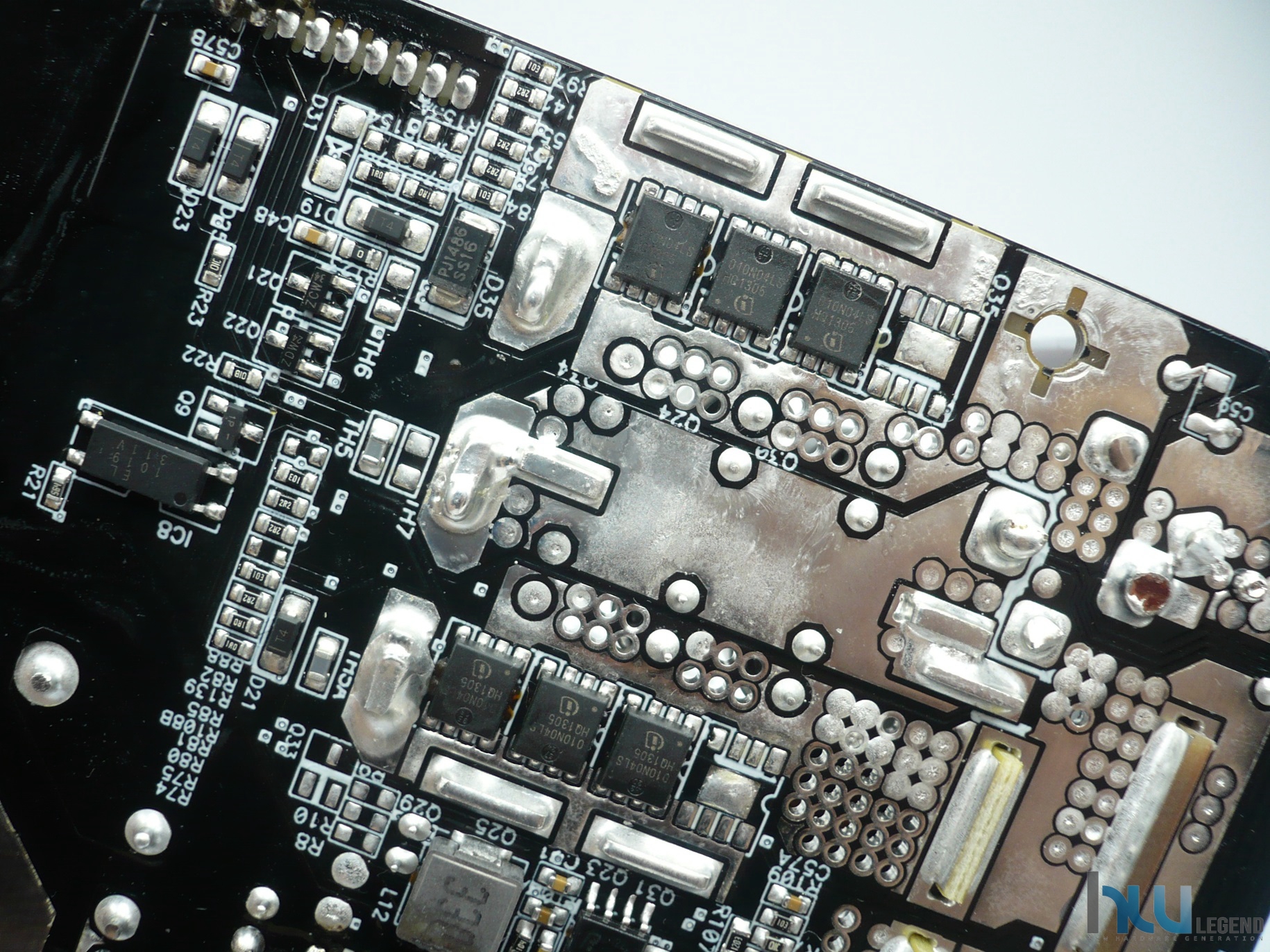 Nella parte posteriore del PCB osserviamo i MOSFET previsti per la regolazione della tensione +12V. Nello specifico il produttore ha previsto sei Infineon OptiMOS BSC010N04LS (40V, 100A @100°C / Rds(on): 1.0mOhm), suddivisi in due batterie da tre unità, più che sufficienti a soddisfare appieno le specifiche previste dallo standard ATX 3.0, essendo più che adeguati a fornire fino a 2.000W di picco.
