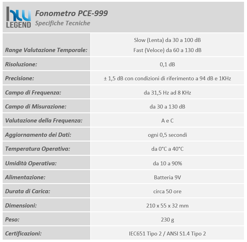 Per il rilevamento della rumorosità durante il funzionamento della ventola abbiamo scelto di usare il fonometro professionale PCE-999 che dispone delle seguenti specifiche tecniche: