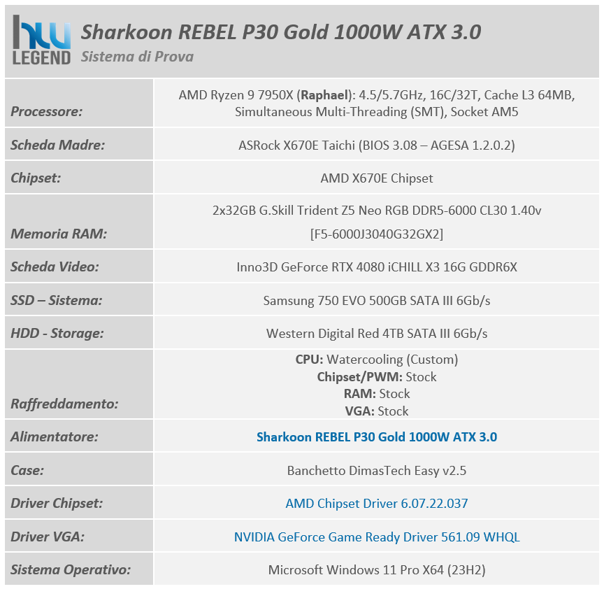 Per effettuare le misurazioni sul nuovo Sharkoon REBEL P30 Gold 1000W ATX 3.0 ci siamo avvalsi della seguente strumentazione: