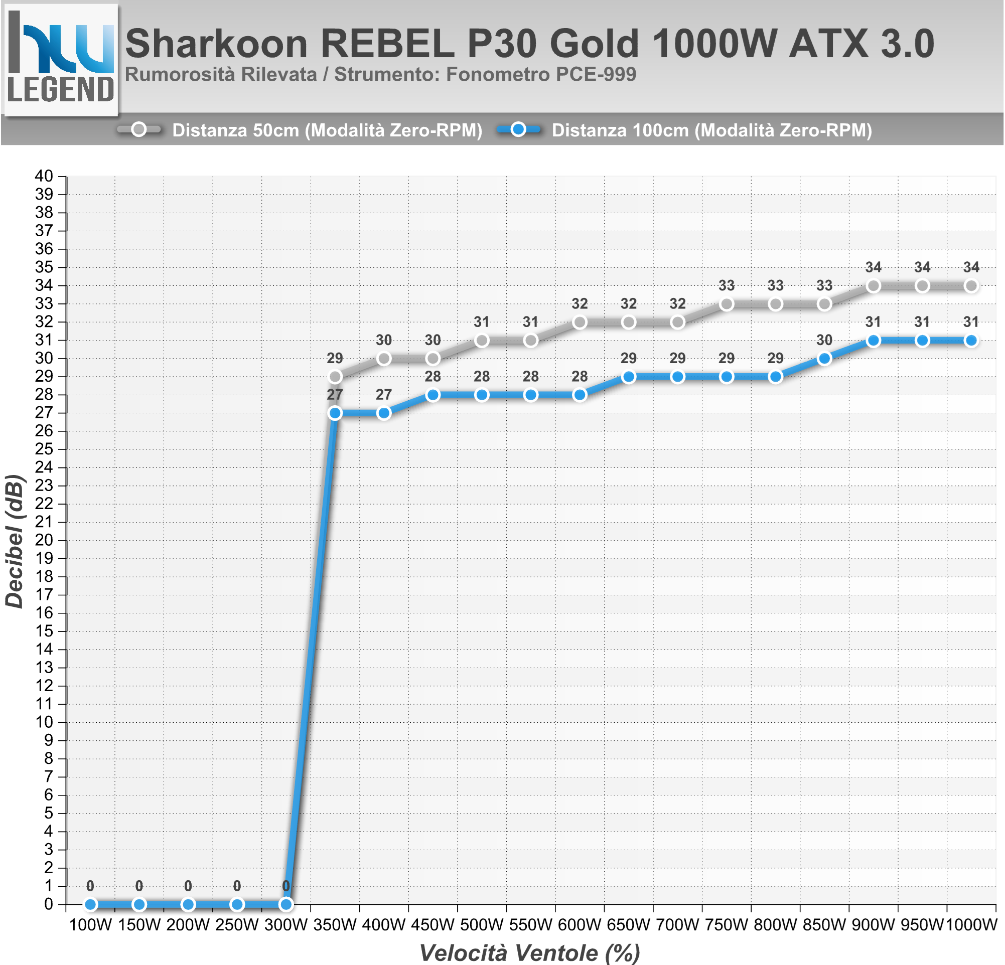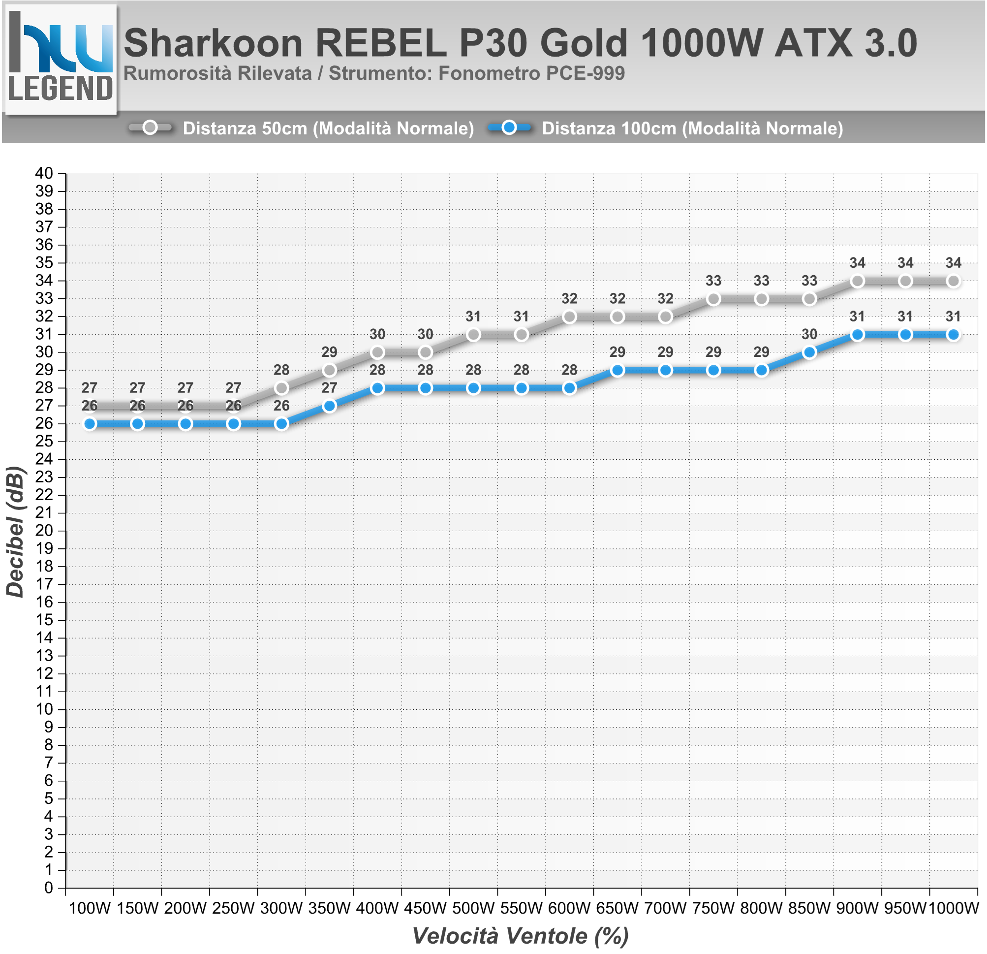 Le misurazioni a 100cm di distanza sono decisamente più indicative e reali, visto che sono state prese con l’alimentatore montato su un cabinet e ad una distanza decisamente più corrispondente alle reali situazioni di utilizzo. Dal grafico, possiamo vedere come la rumorosità della ventola rimanga costante e si attesti sui “28-29db” fino ad un carico di circa 850W, per poi aumentare linearmente fino ad appena 31b con un carico prossimo al 100%.