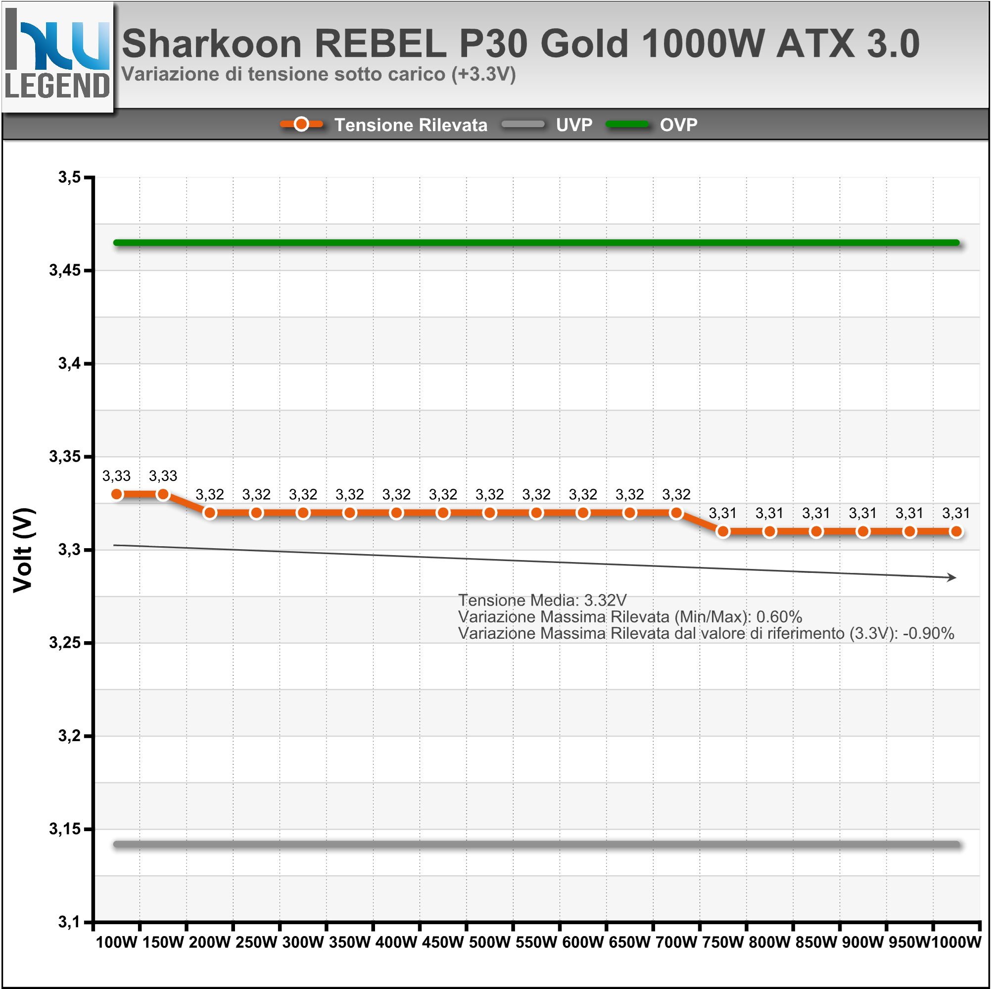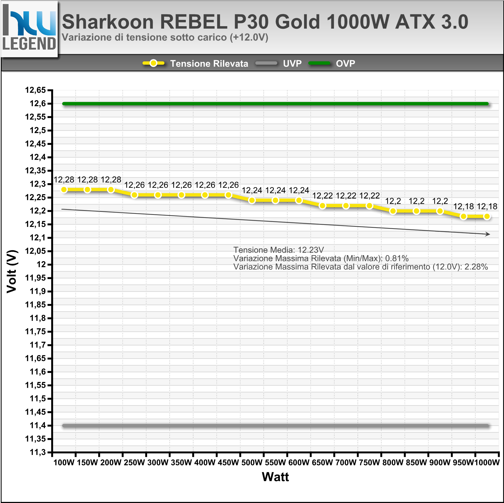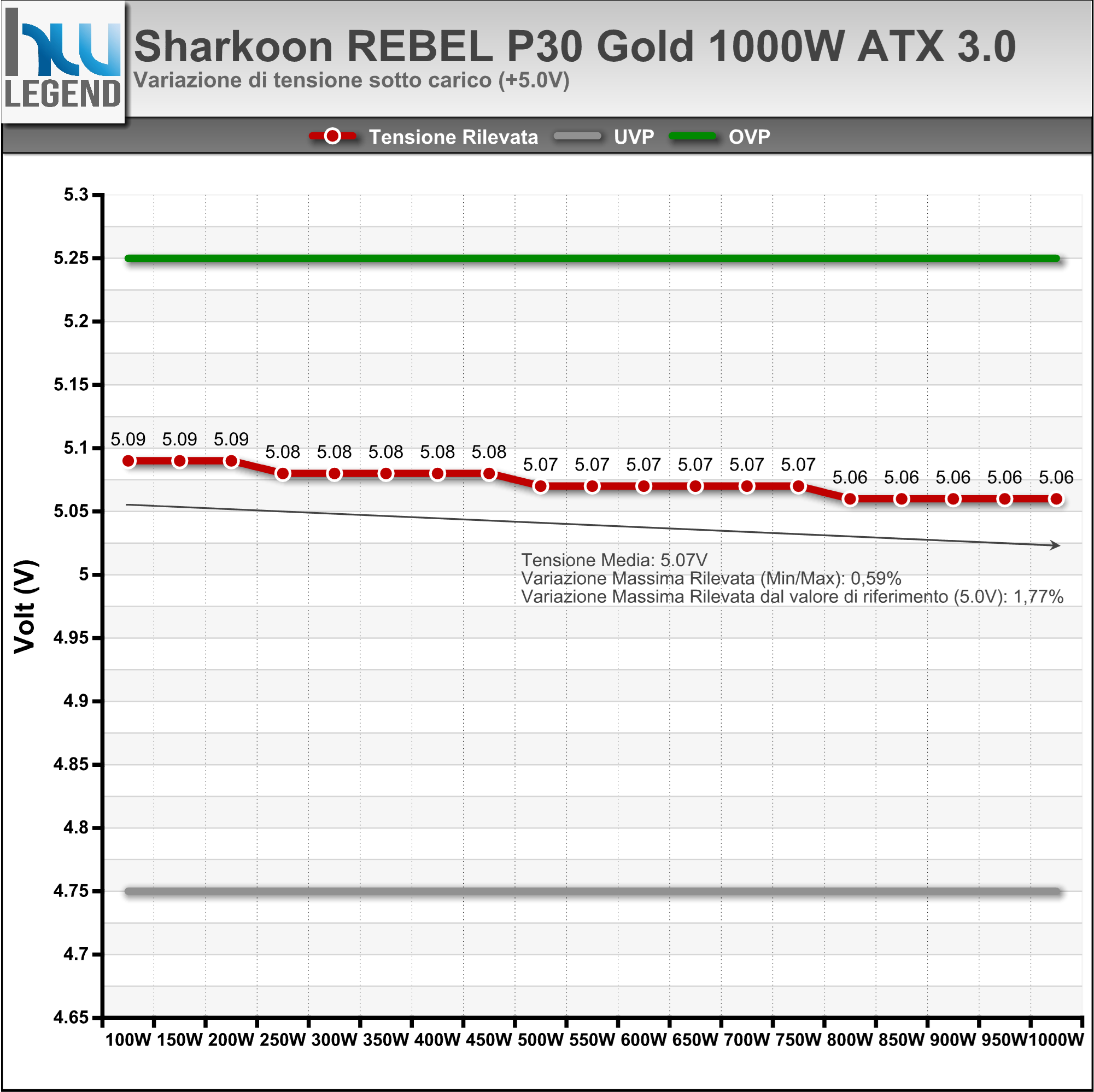 I nostri test sono stati effettuati con un carico proporzionale su ogni Rail raggiungendo una potenza massima assorbita di 1000W. I limiti UVP e OVP sono stati fissati calcolando uno scostamento massimo di +/- 5% rispetto alla tensione di riferimento.