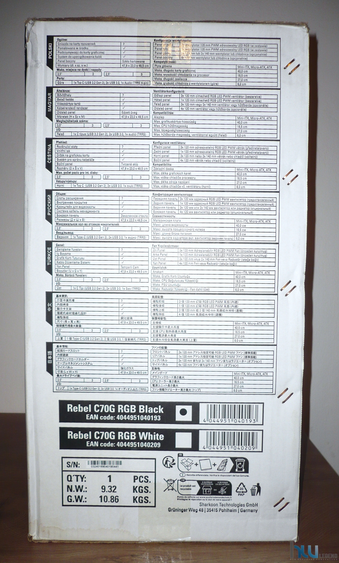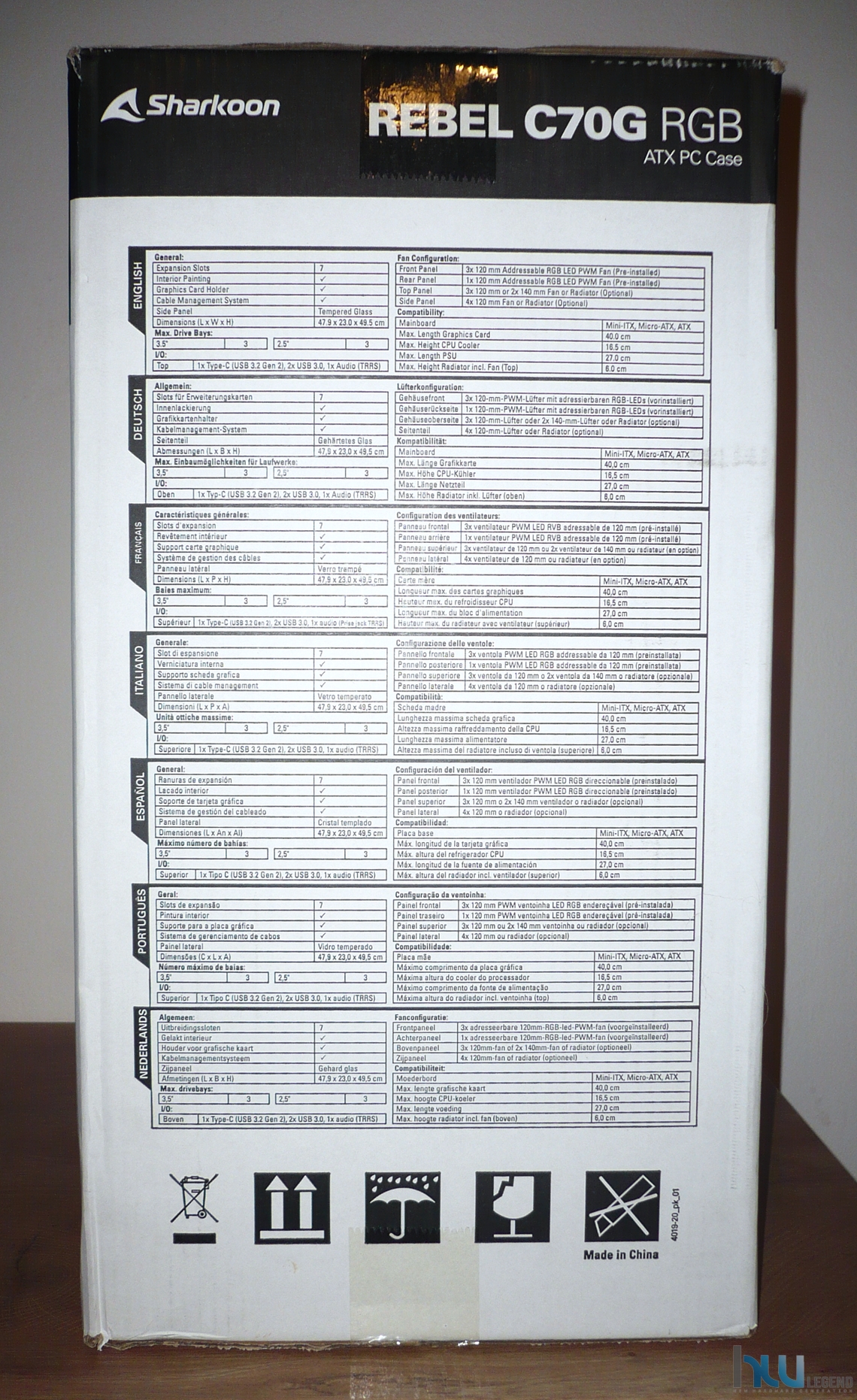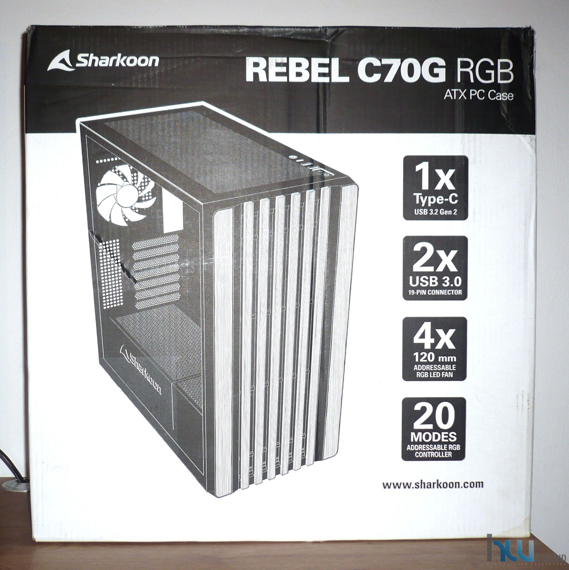 Il nuovissimo Sharkoon REBEL C70G RGB Black giunto in redazione è, nello specifico, il modello con codice EAN 4044951040193, contraddistinto da una colorazione interna ed esterna completamente nera opaca (Matte Black) e dalla presenza di ben quattro ventole proprietarie preinstallate da 120mm di diametro di ottima qualità. La confezione che lo racchiude è interamente realizzata in robusto cartone dalle dimensioni generose, capace di garantire l’assoluta integrità del prodotto anche nell’eventualità di un trasporto movimentato.