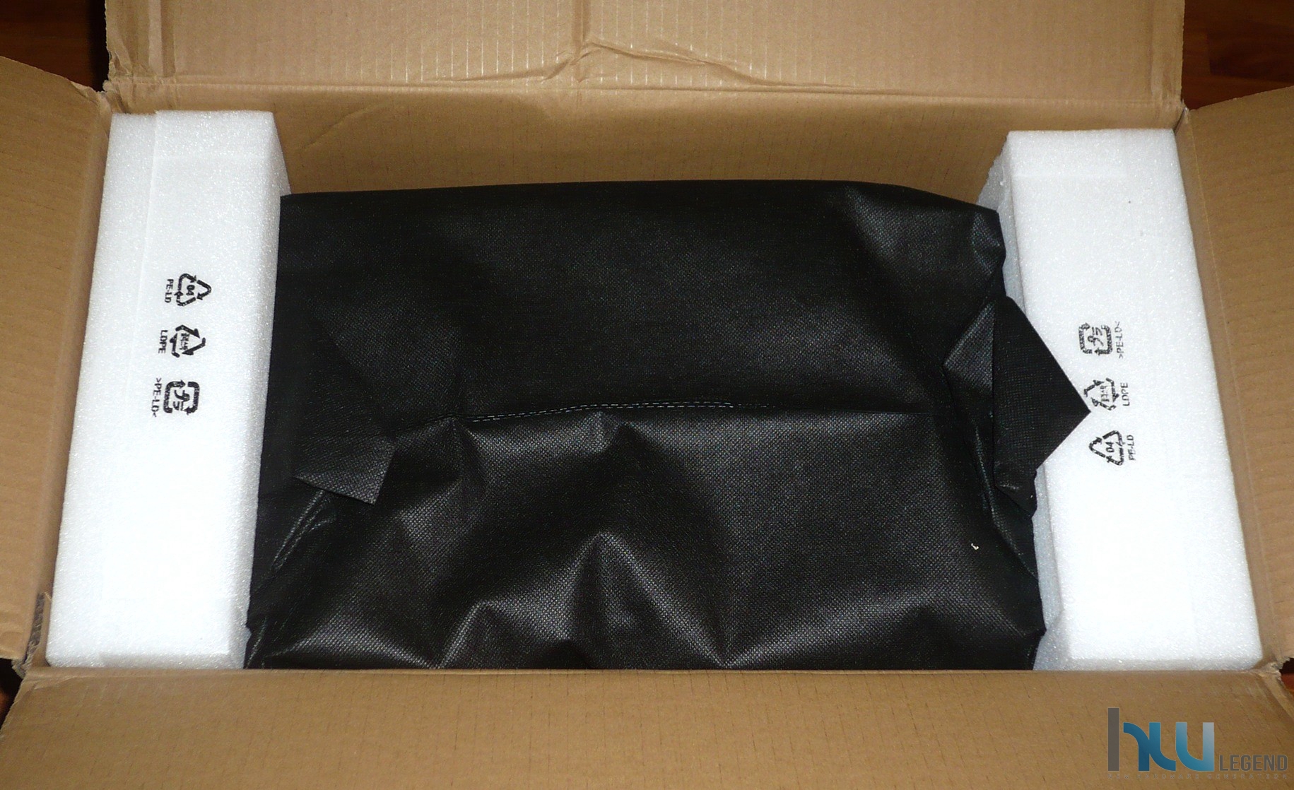 La prima cosa che notiamo sono gli ottimi materiali utilizzati per l’imballaggio. Lo chassis è interamente avvolto in un pregiato tessuto tramato e ancorato tra due semi-gusci di materiale espanso che lo proteggono da urti e graffi accidentali.