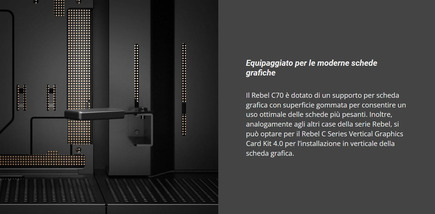 Per quanto riguarda nello specifico proprio la scheda grafica, ed in considerazione della mole e del peso delle moderne soluzioni di fascia alta, il produttore ha previsto un pratico Holder gommato integrato all’interno del cabinet, così da ridurre al minimo lo sforzo a carico dello slot PCI-Express della scheda madre. Il REBEL C70G RGB, inoltre, offre anche la possibilità di procedere all’installazione verticale della scheda grafica, ovviamente a patto di acquistare l’apposito adattatore REBEL C-Series Vertical Graphics Card Kit (VGCK) 4.0, provvisto di cavo riser PCIe 4.0.