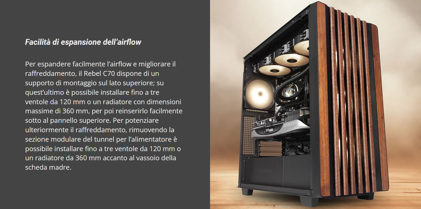 Il generoso spazio interno offre ottime possibilità di integrazione sia di complessi impianti a liquido di tipo tradizionale e sia delle ormai diffuse soluzioni All-in-One. Il nuovo REBEL C70G RGB, infatti, prevede la possibilità di ospitare un radiatore fino a 240 millimetri nella parte interna (360mm rimuovendo una parte della cover del vano PSU), oltre che, all’occorrenza, un secondo radiatore, da massimo 360 millimetri nella parte superiore.