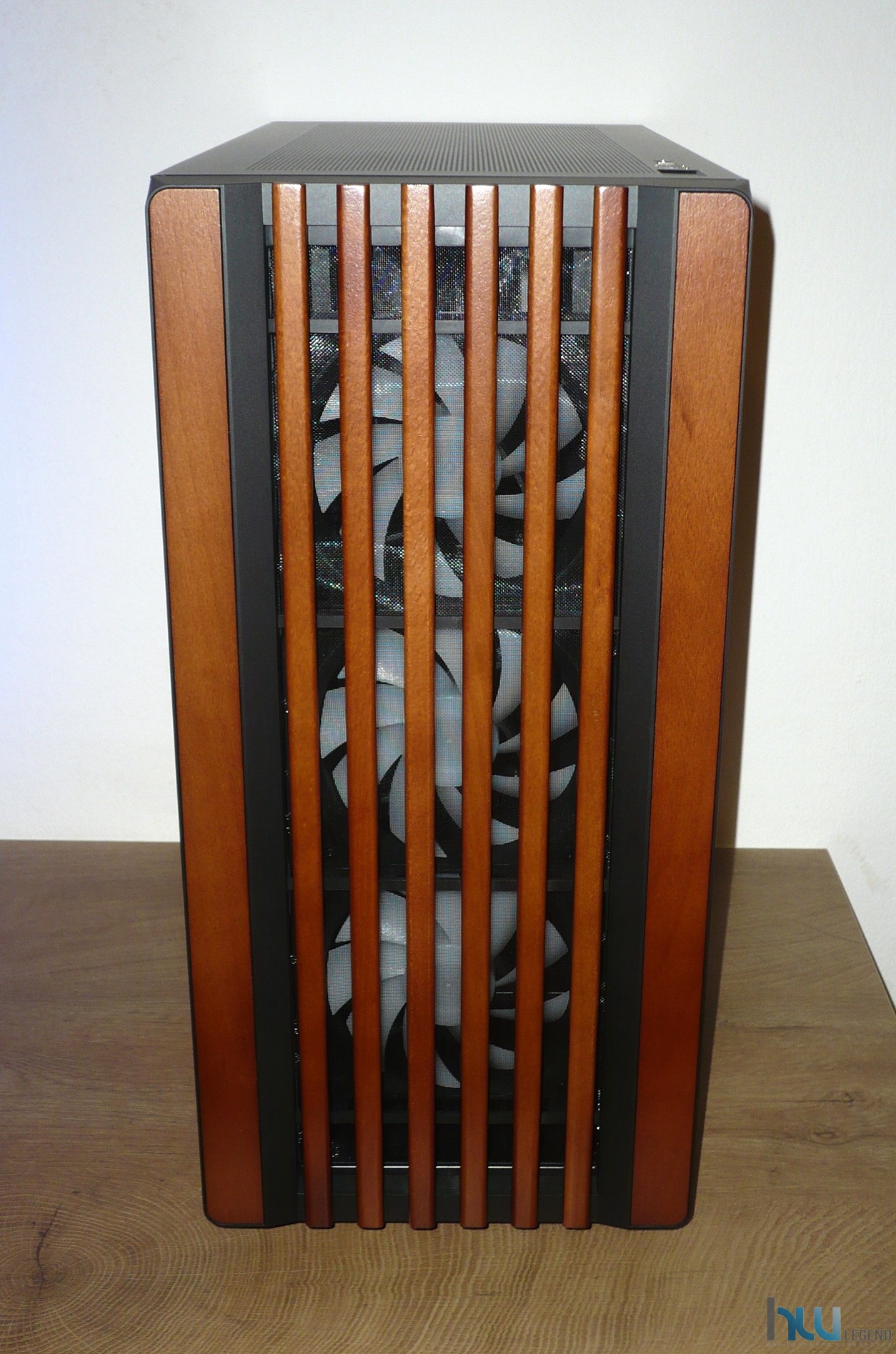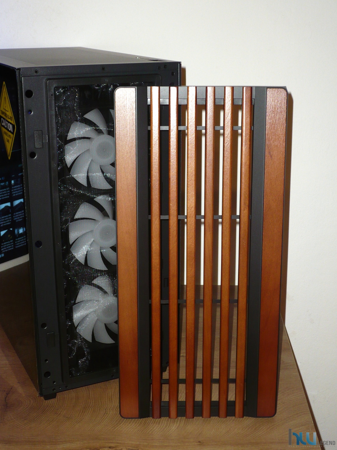 Il pannello frontale, realizzato in robusta plastica ABS, prevede la presenza di inserti in legno che non passano certo inosservati e rappresentano un tocco distintivo nel panorama dei cabinet da gaming, capace di catturare immediatamente l’attenzione. Nella parte sottostante troviamo un pratico filtro antipolvere rimuovibile, pensato per non ostacolare eccessivamente il pescaggio dell’aria da parte delle ventole e, allo stesso tempo, limitare al minimo il trasporto di polvere verso l’interno del cabinet.