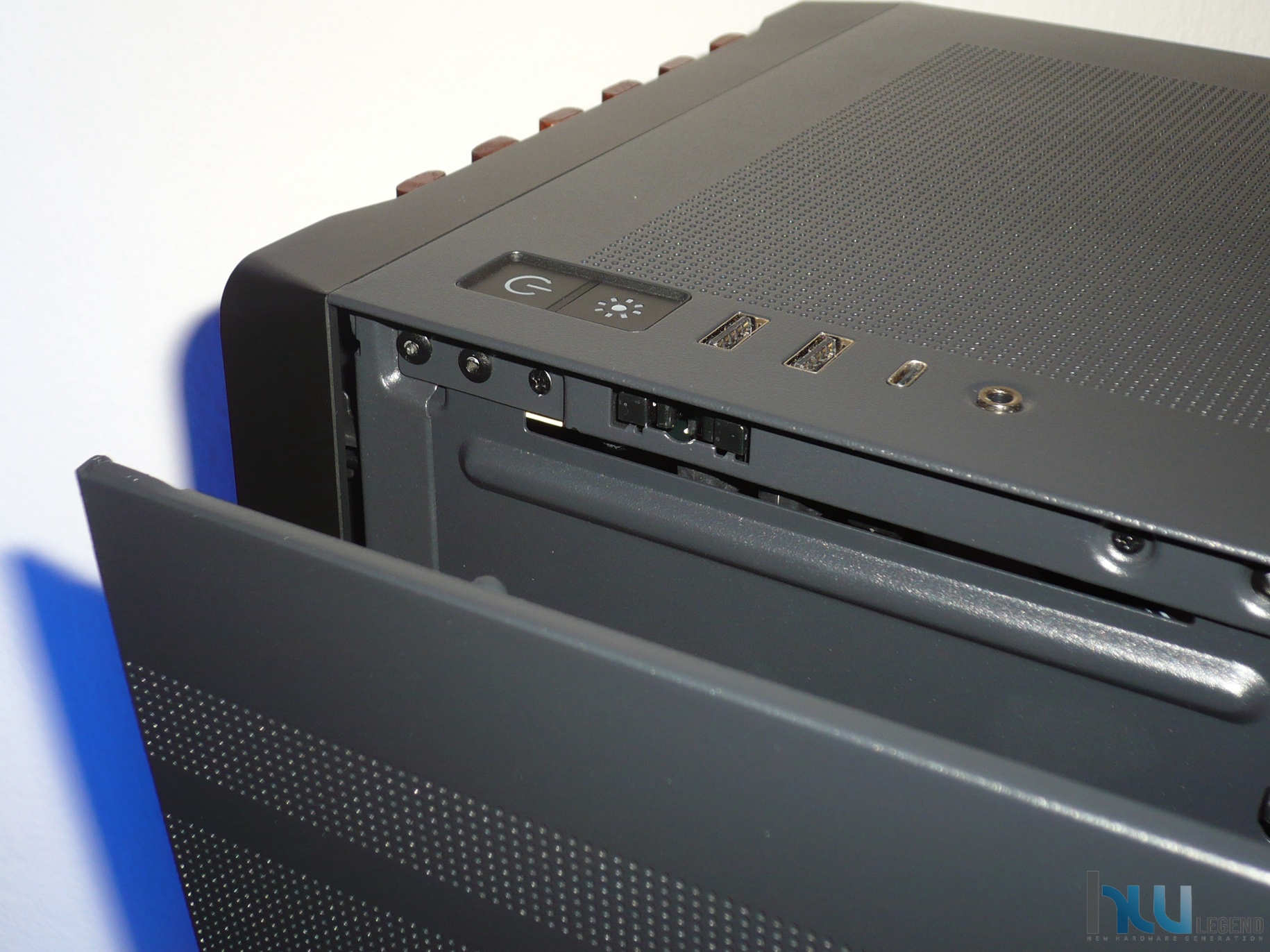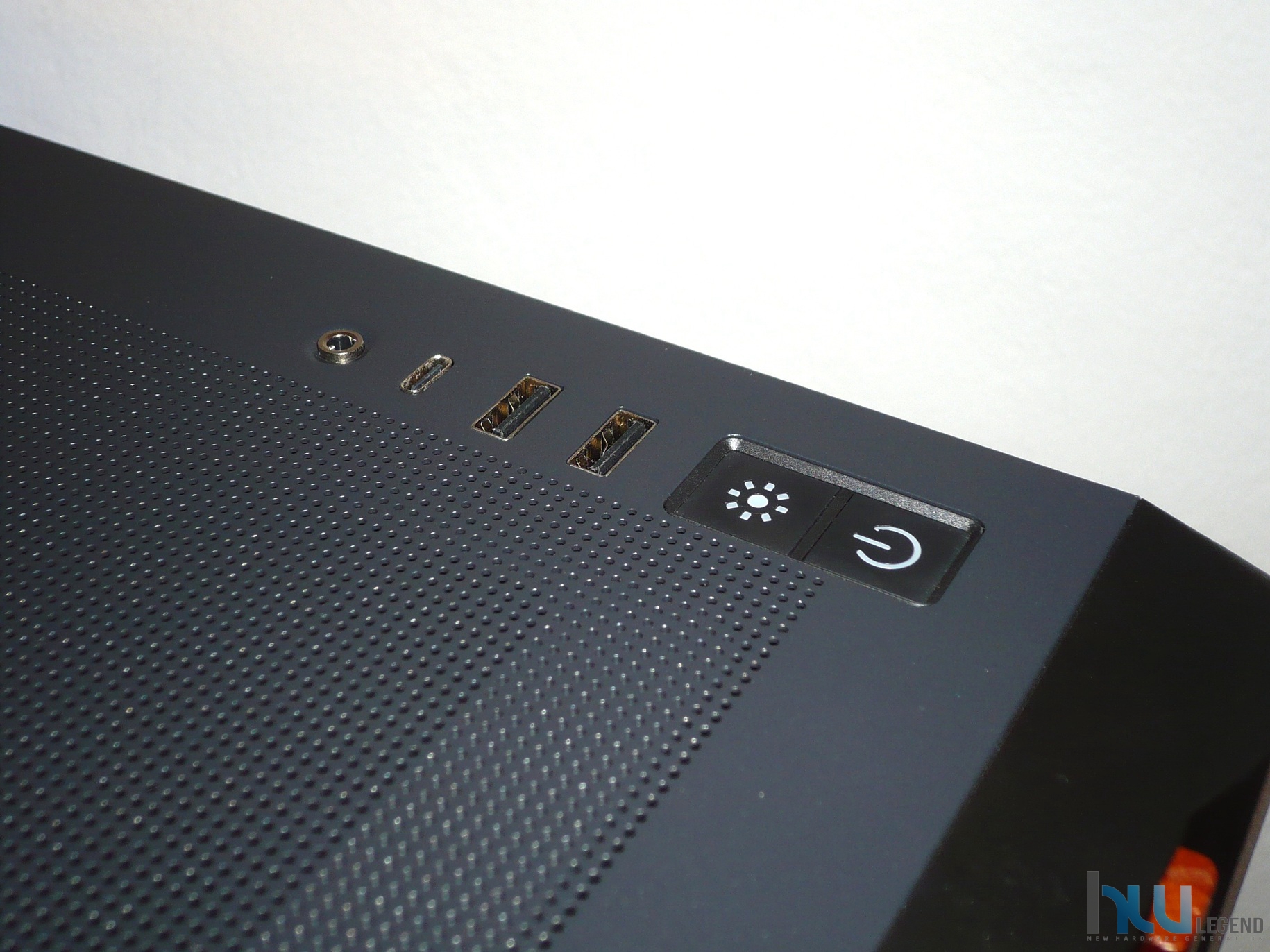 Al contrario, è dotata di un pannello I/O completo posizionato nella parte superiore del cabinet. Il produttore ha incluso, oltre al classico pulsante di accensione, un utile pulsante per la gestione manuale dell’illuminazione A-RGB integrata, un Jack da 3.5” per cuffie o microfono, due porte USB 3.0 Type-A da 5Gbps e una porta USB 3.2 Gen2 Type-C da 10Gbps.