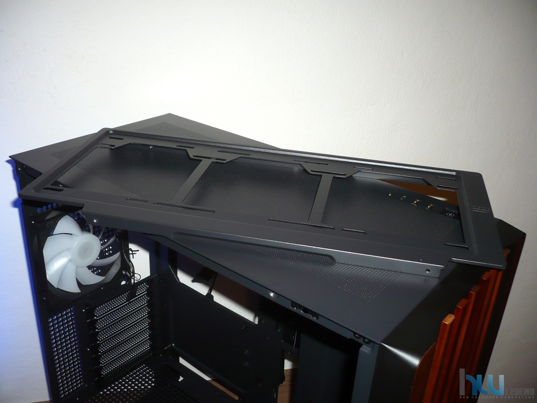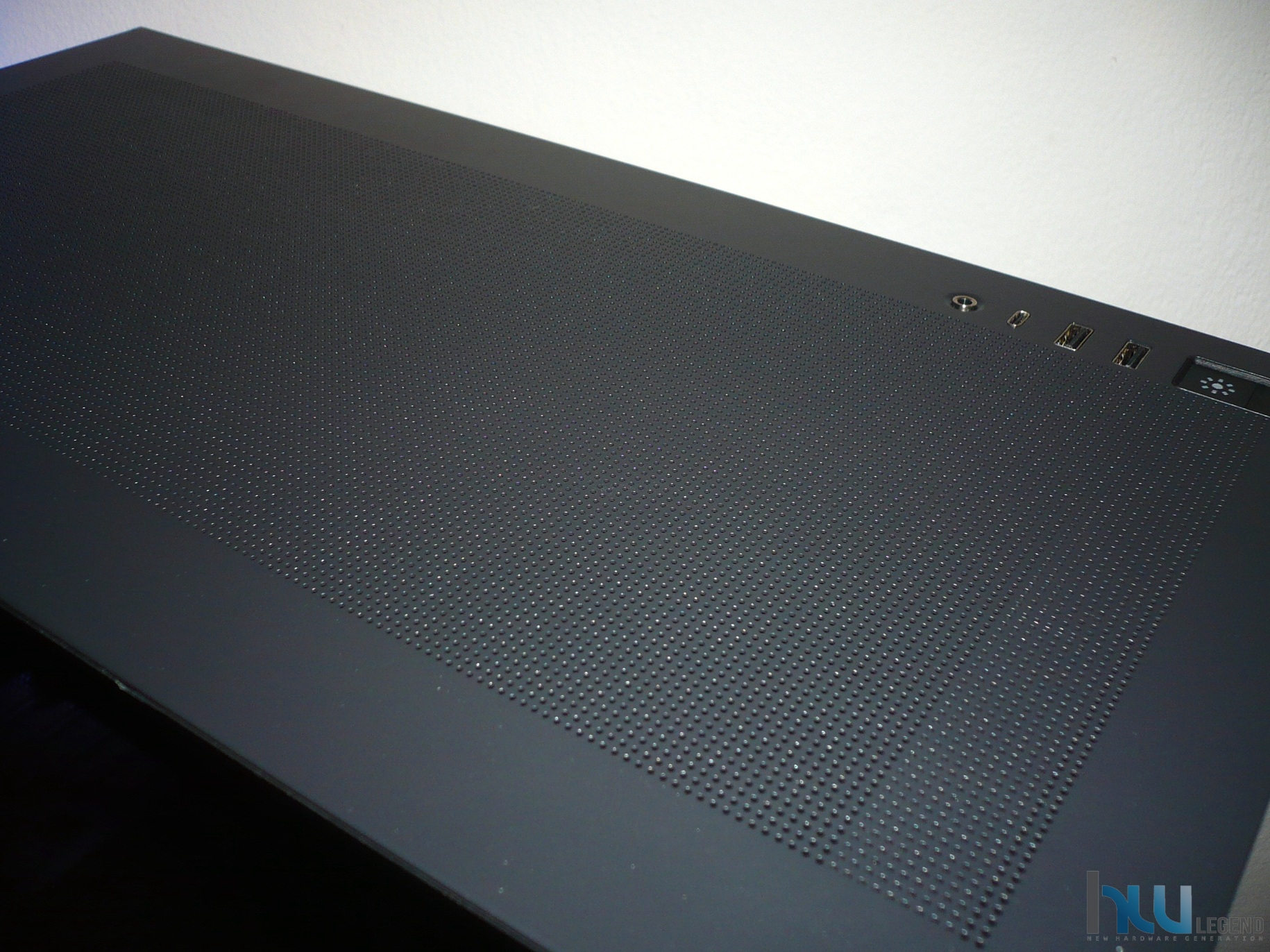 Nella parte superiore dello chassis possiamo notare, oltre al già osservato pannello I/O, anche l’alloggiamento per un massimo di tre ventole di raffreddamento da 120 millimetri di diametro, oppure eventualmente una coppia da 140 millimetri di diametro. Al pari del pannello laterale destro, anche la parte superiore prevede una generosa grigliatura mesh, pensata per assicurare un ricircolo ottimale dell’aria.