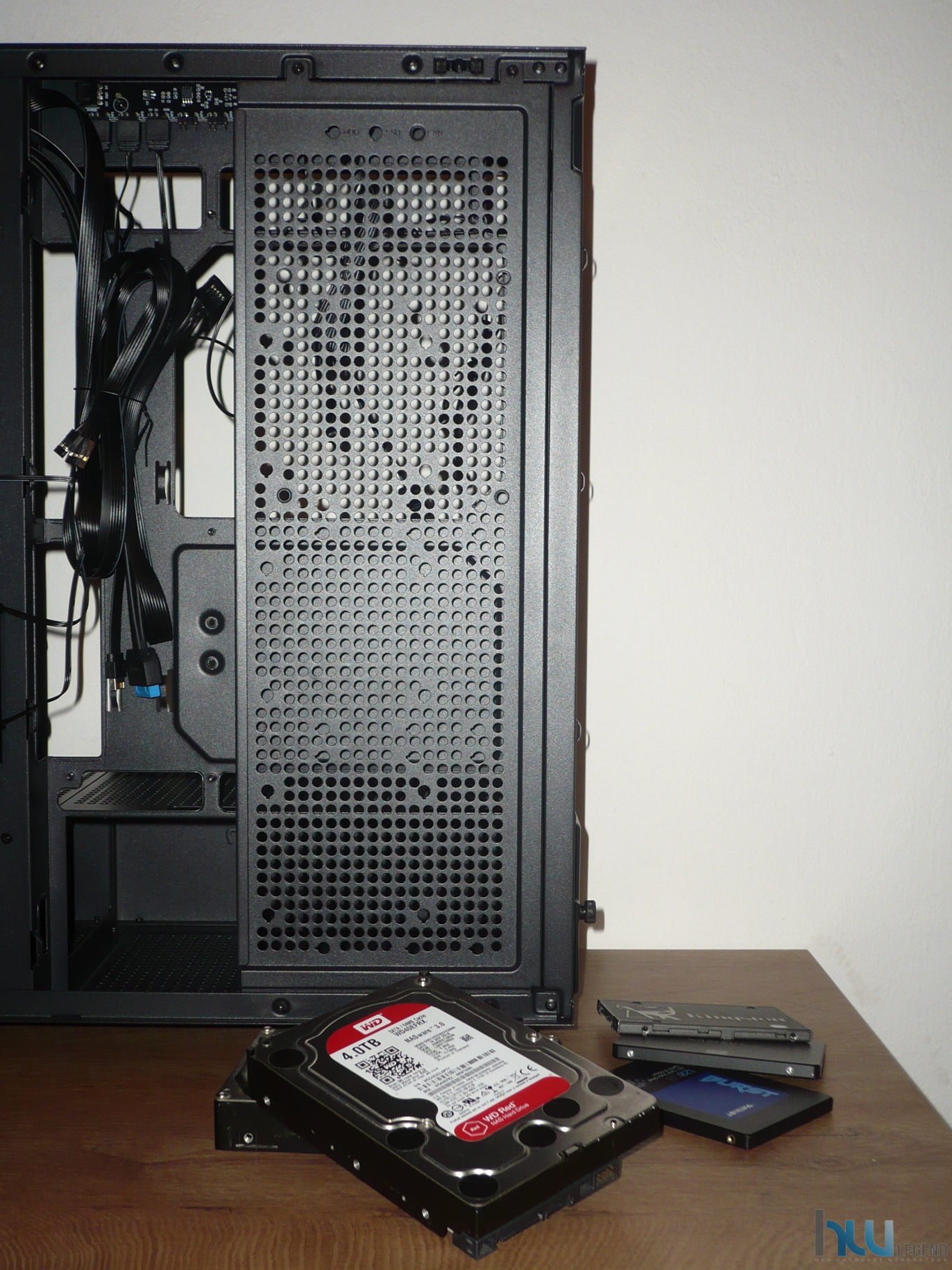 L’aver dislocato tutti gli alloggiamenti dedicati alle unità di memorizzazione nella parte posteriore consente di poter contare, all’evenienza, su un maggiore spazio nella parte opposta del cabinet, indubbiamente utile ad esempio per il collocamento di una combo Pompa/Reservoir oppure di un radiatore più grande nel caso si voglia procedere all’integrazione di un impianto a liquido di tipo All-in-One oppure custom.