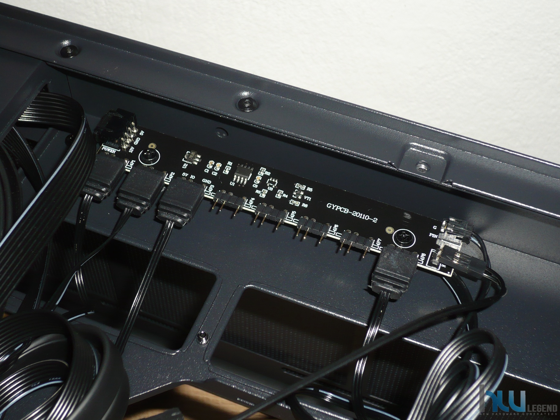 Non lontano dal supporto per le unità di memorizzazione, troviamo un utile HUB A-RGB a otto canali, di cui quattro già occupati per gestire l’illuminazione integrata nelle ventole di raffreddamento preinstallate. Il produttore ha previsto una doppia modalità di gestione: manuale, tramite il pulsante dedicato situato nel pannello I/O del cabinet, oppure tramite il software fornito dal produttore della scheda madre, a patto che quest’ultima supporti pienamente la tecnologia Addressable-RGB (A-RGB).