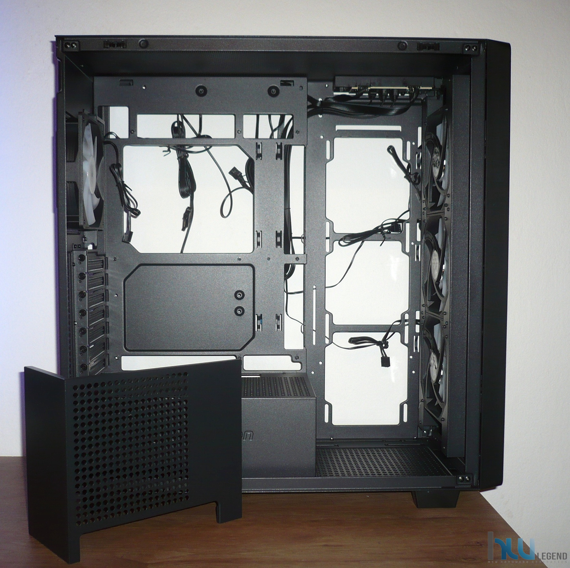 Il produttore ha previsto una notevole modularità interna che consentirà all’utente di poter personalizzare gli spazi a seconda delle proprie necessità. Nella configurazione originale abbiamo visto che alla destra del vassoio della scheda madre è presente una cover metallica che, tra le altre cose, contribuisce a facilitare la gestione del cable-management. Così ad un primo sguardo magari non ci si rende conto che sarà possibile rimuoverla, così da poter all’occorrenza installare ulteriori due ventole di raffreddamento, da massimo 120 millimetri di diametro.