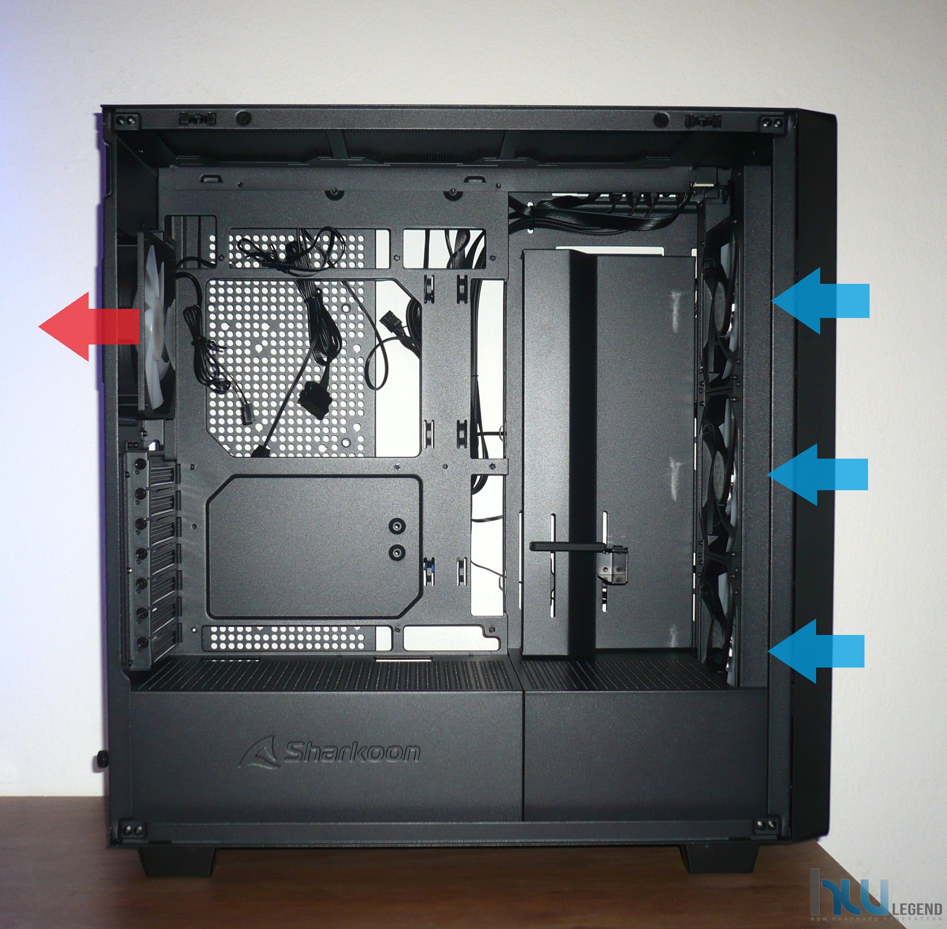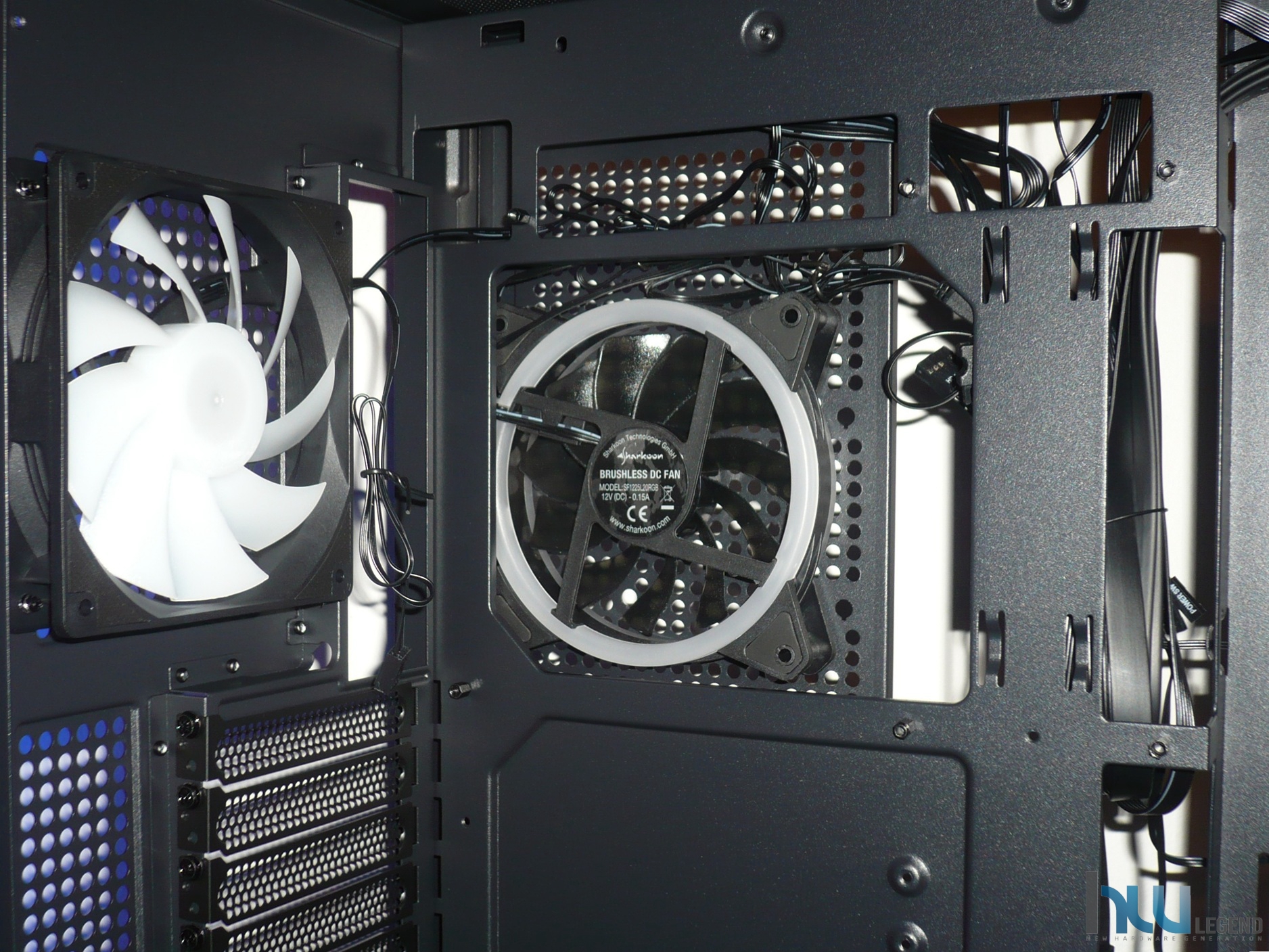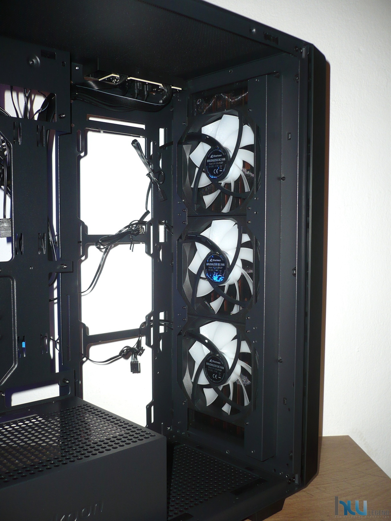 Il cabinet vanta potenzialità molto interessanti anche per tutti coloro che, al contrario, intendono mantenersi fedeli alle più tradizionali soluzioni ad aria, a cominciare dal pieno supporto per dissipatori a torre per CPU fino a ben 165 millimetri di altezza. Il produttore tedesco ha previsto in dotazione ben quattro ottime ventole da 120 millimetri di diametro, ovviamente proprietarie, tre delle quali montate in immissione nella parte frontale e la restante in estrazione nel retro dello chassis. Se questo non bastasse è prevista la possibilità di aggiungerne altre, sempre da 120 o da 140 millimetri, in maniera da ottenere un flusso d’aria decisamente elevato ed ancor più ottimale.