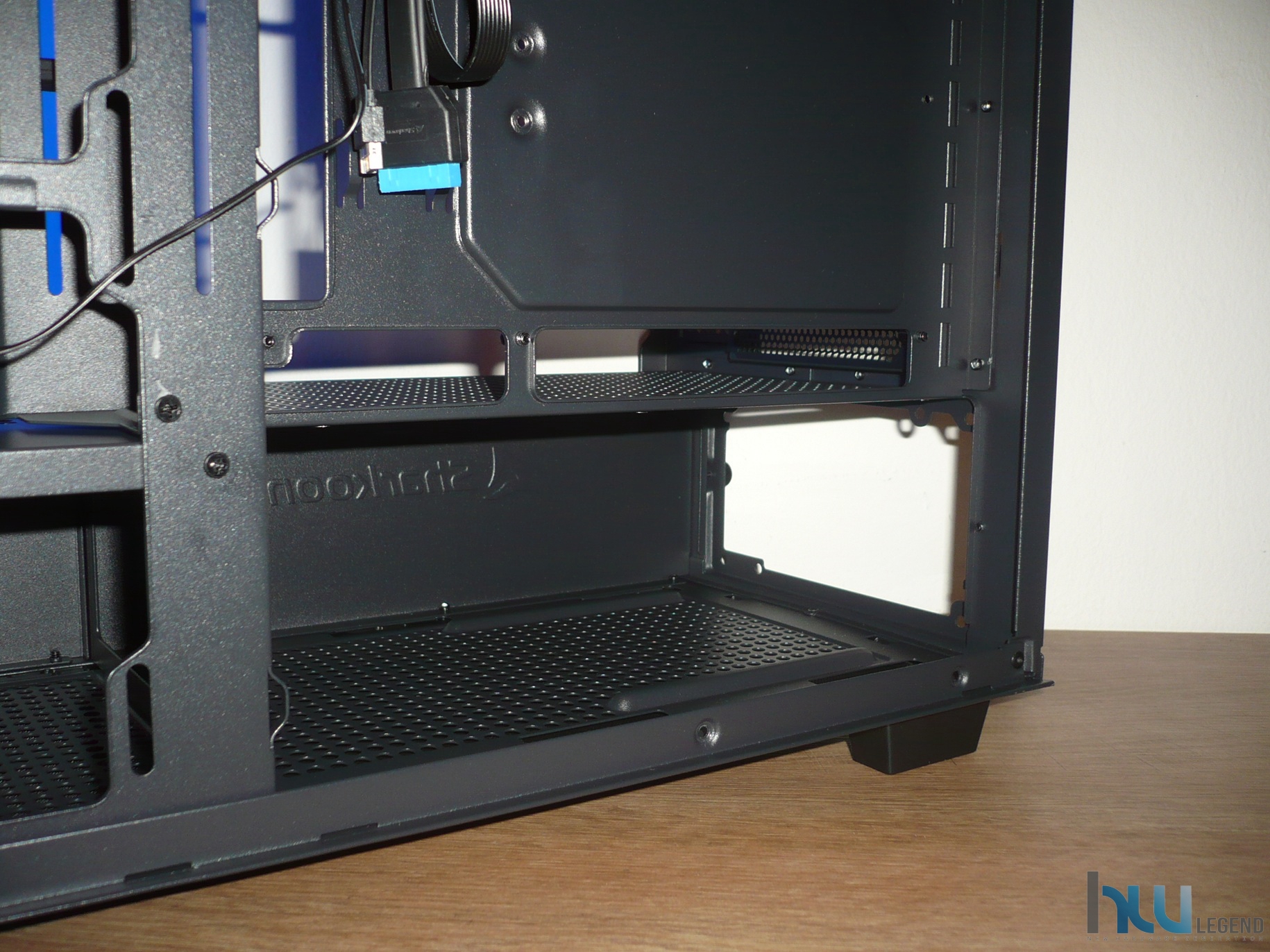 Spostandoci ad analizzare la parte inferiore interna dello chassis, la prima cosa che balza immediatamente all’aocchio è la presenza di una grande copertura metallica che ricopre il vano dedicato all’alloggiamento dell’alimentatore ATX (fino ad un massimo di 270 millimetri di lunghezza), a tutto vantaggio dell’estetica e della gestione della componentistica interna e dei cavi da parte dell’utente.