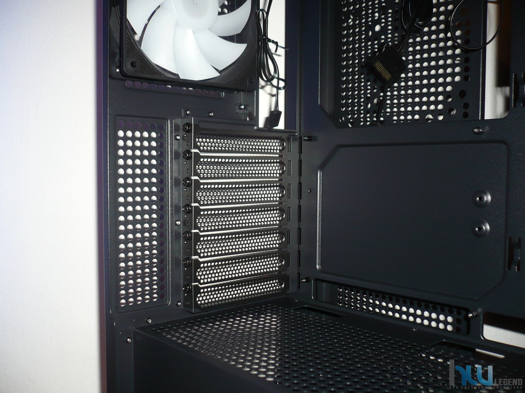 Appare evidente una notevole pulizia e una quasi maniacale cura per i dettagli, seppur si tratta di una parte del cabinet che nella maggior parte dei casi non viene mantenuta a vista. Il nuovo REBEL C70G RGB mette a disposizione 7 slot di espansione, ognuno dei quali provvisto di una resistente griglia in metallo opportunamente forata per favorire la fuoriuscita dell’aria all’esterno dello chassis.