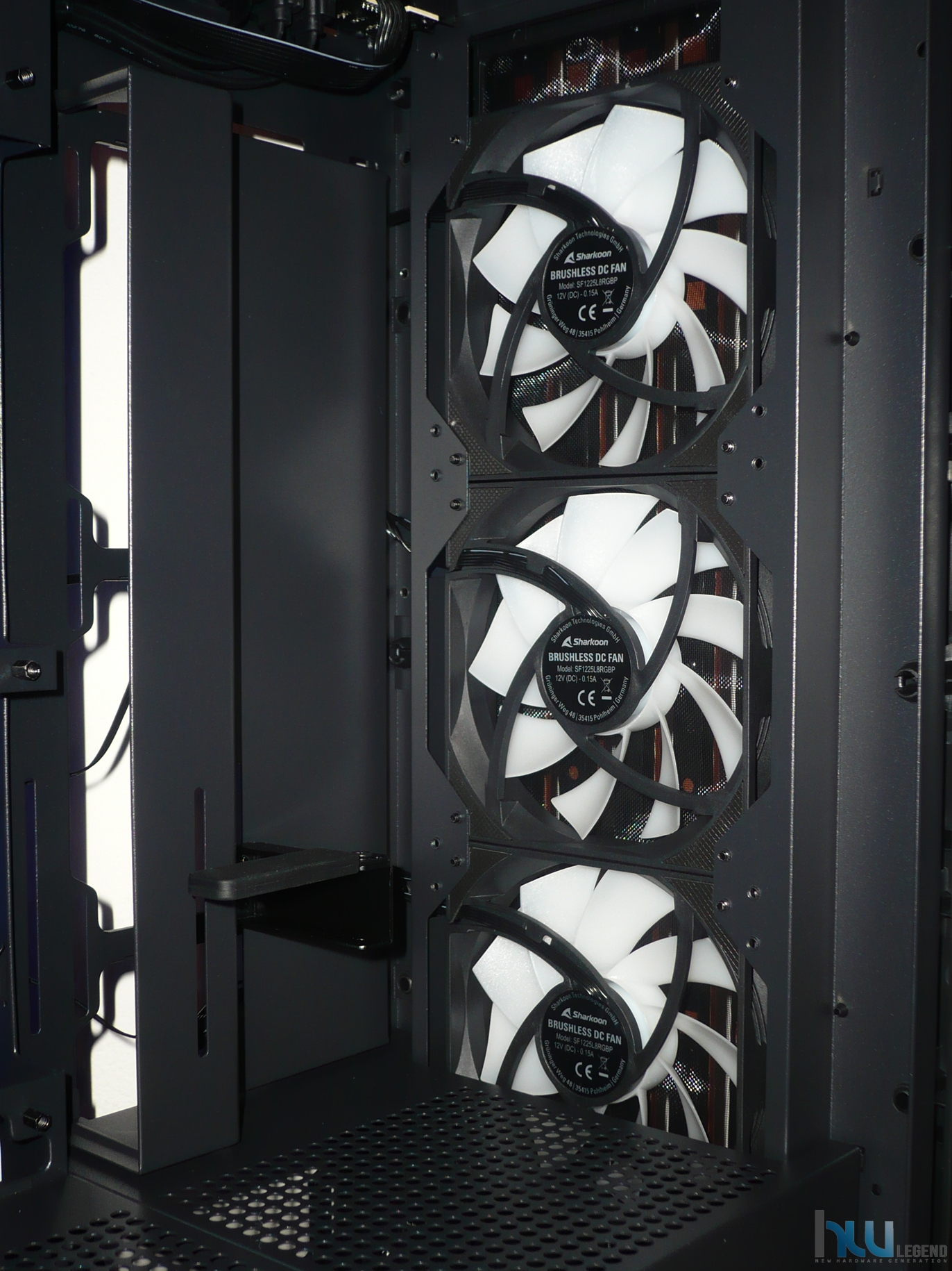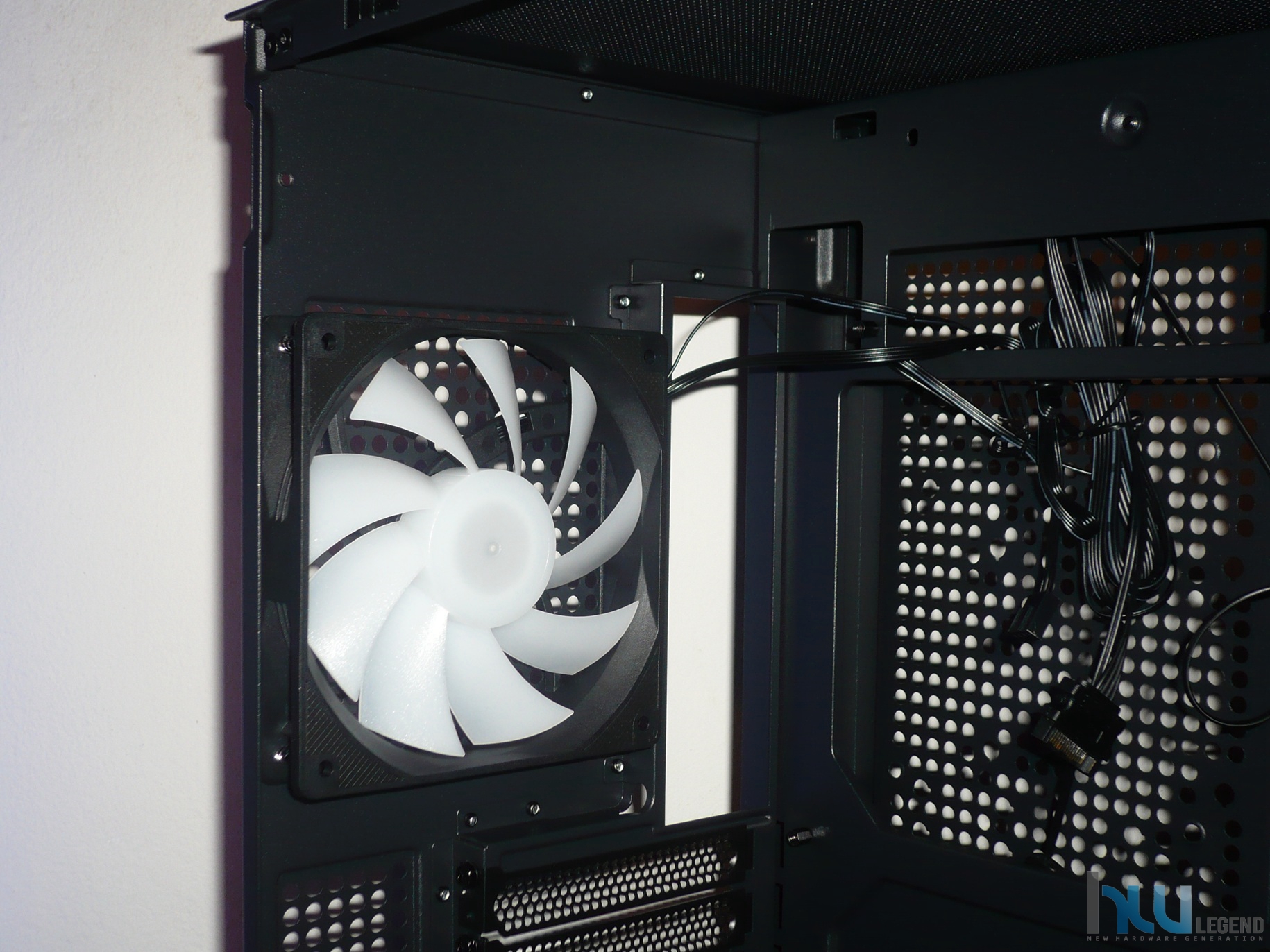 Il fissaggio sfrutta una serie di pratici incastri, in modo tale da rendere agevoli le operazioni di pulizia. Una volta rimosso il filtro antipolvere avremo accesso alle ventole proprietarie preinstallate, tutte da 120 millimetri di diametro, appartenenti alla famiglia SF1225L8RGBP PWM, e provviste di illuminazione RGB integrata.