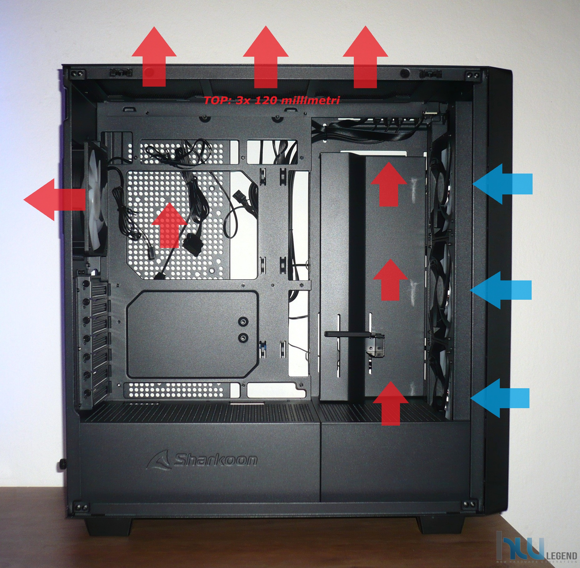 In questa situazione, le ventole di “Colore Blu” immettono una buona quantità di aria fredda all’interno dello chassis, mentre le restanti ventole, di “Colore rosso“, provvedono ad espellere verso l’esterno, in maniera estremamente efficiente, l’aria ormai calda.