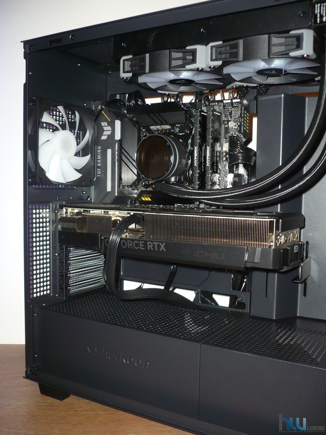 La scheda grafica utilizzata, nello specifico una INNO3D GeForce RTX 4070 iCHILL X3 12GB GDDR6, provvista di processore grafico AD104-250 basato su architettura Ada Lovelace e contraddistinta da una lunghezza di 334 millimetri ed un ingombro in altezza di 3 slot, non rappresenta certamente un problema per questo cabinet.