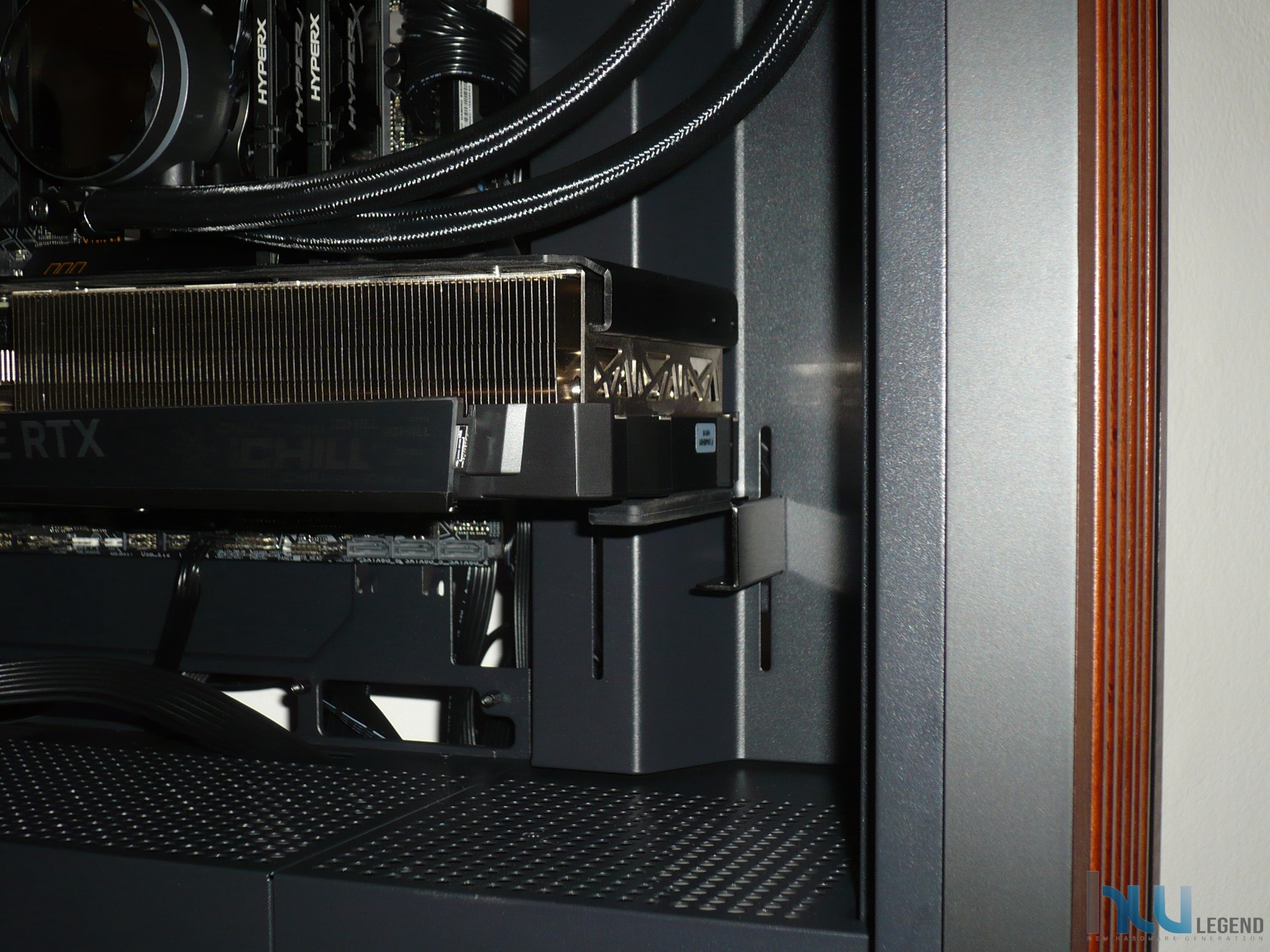 Il foro presente nel Motherboad-Tray consente un agevole passaggio del cavo necessario alla corretta alimentazione della scheda, di tipo 12VHPWR, a tutto vantaggio dell’ordine interno. In considerazione della mole e soprattutto del peso di questa soluzione grafica discreta abbiamo ritenuto opportuno sfruttare il supporto integrato regolabile Anti-Sag previsto nel cabinet.