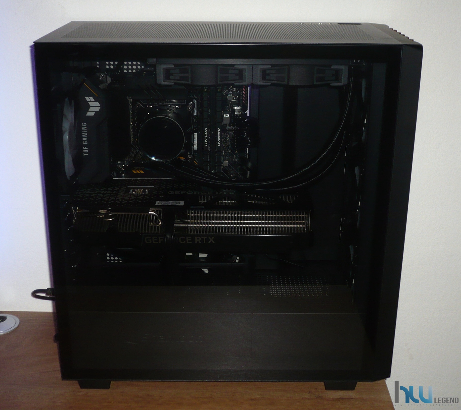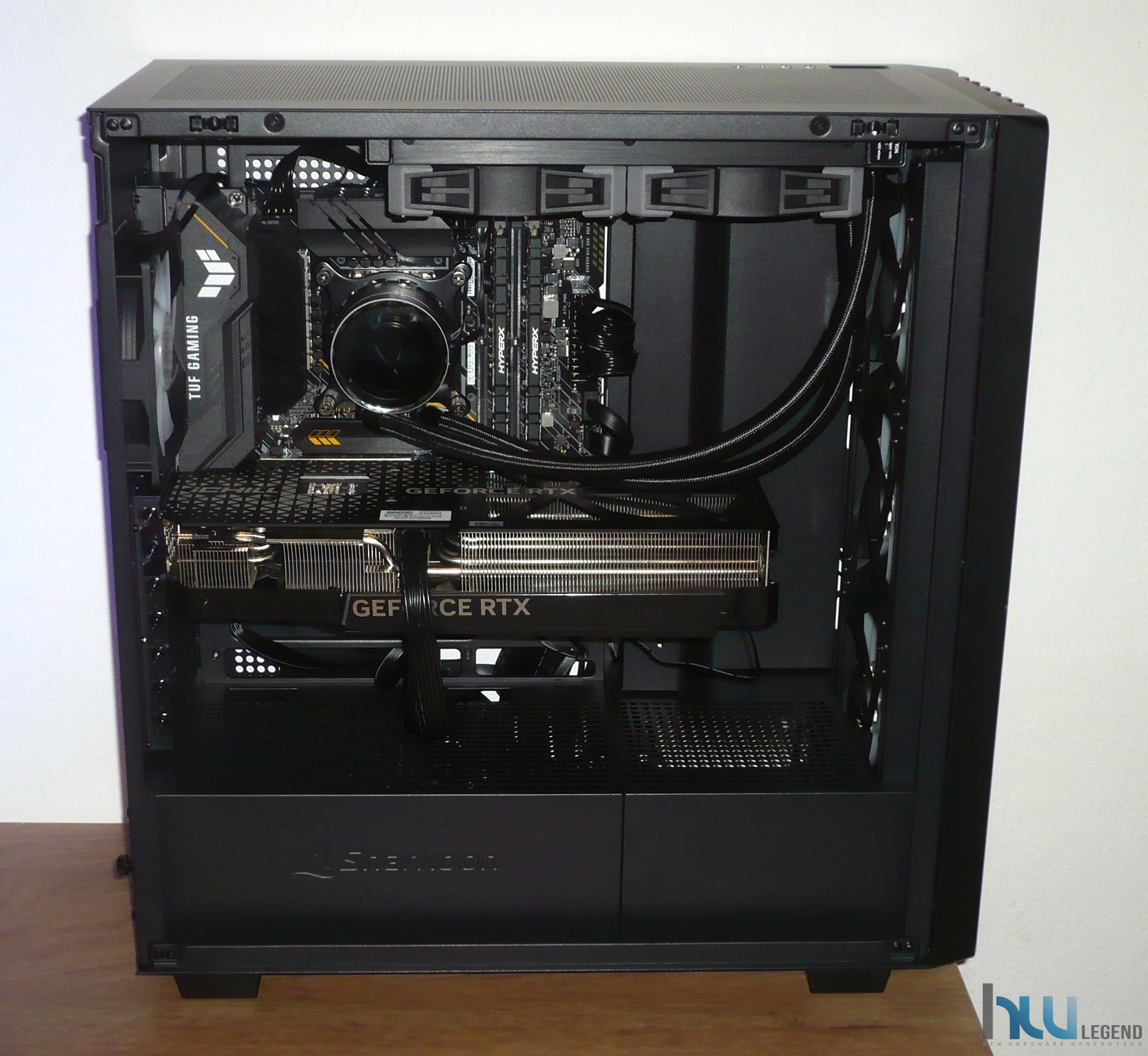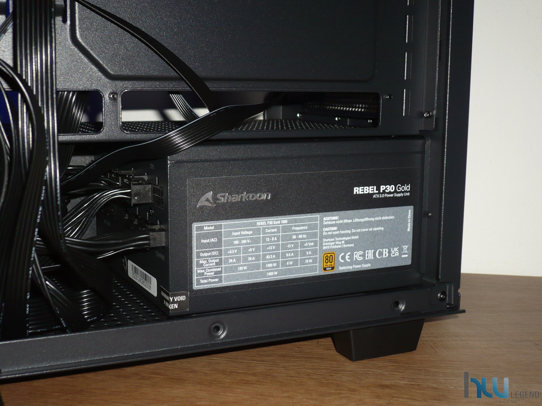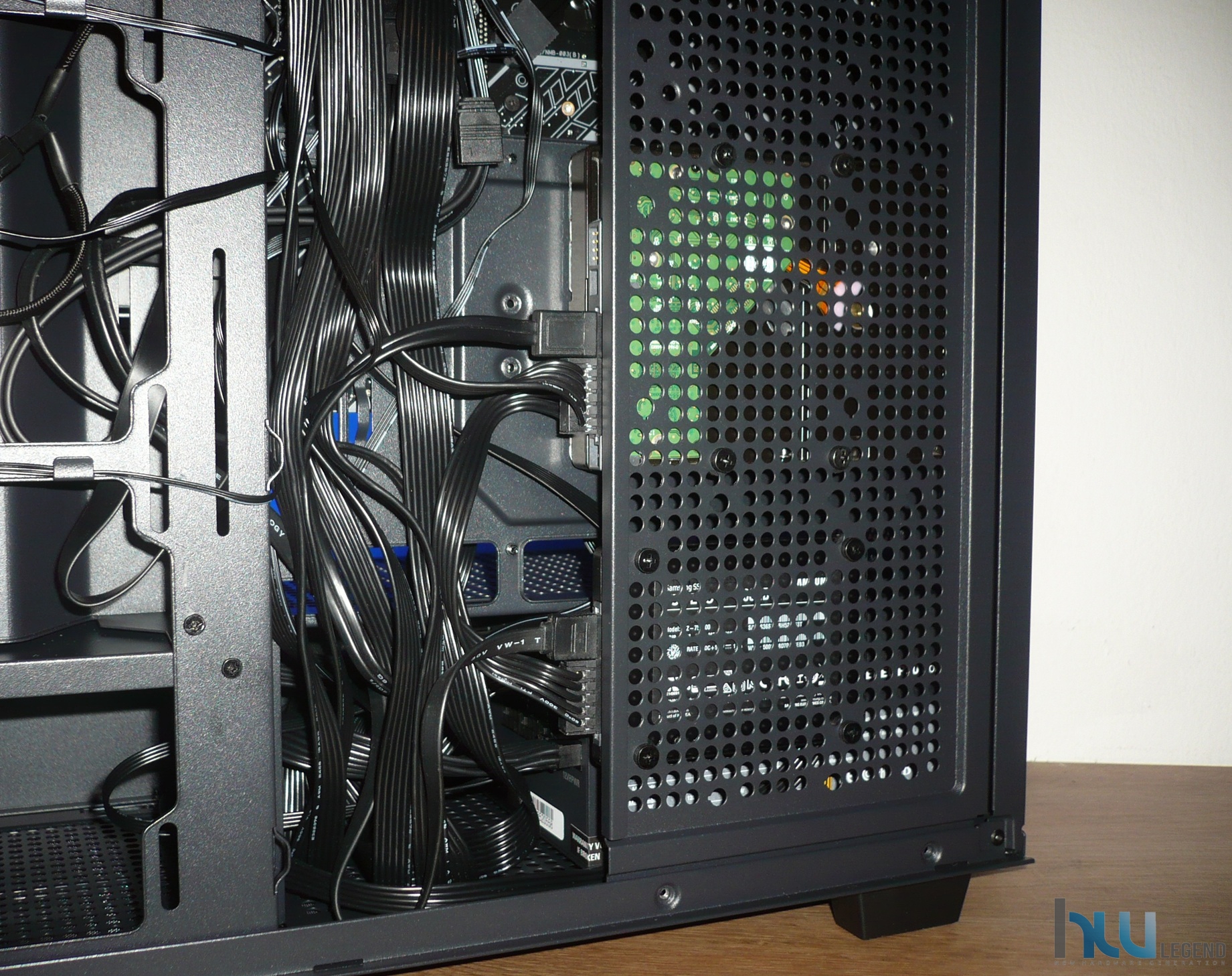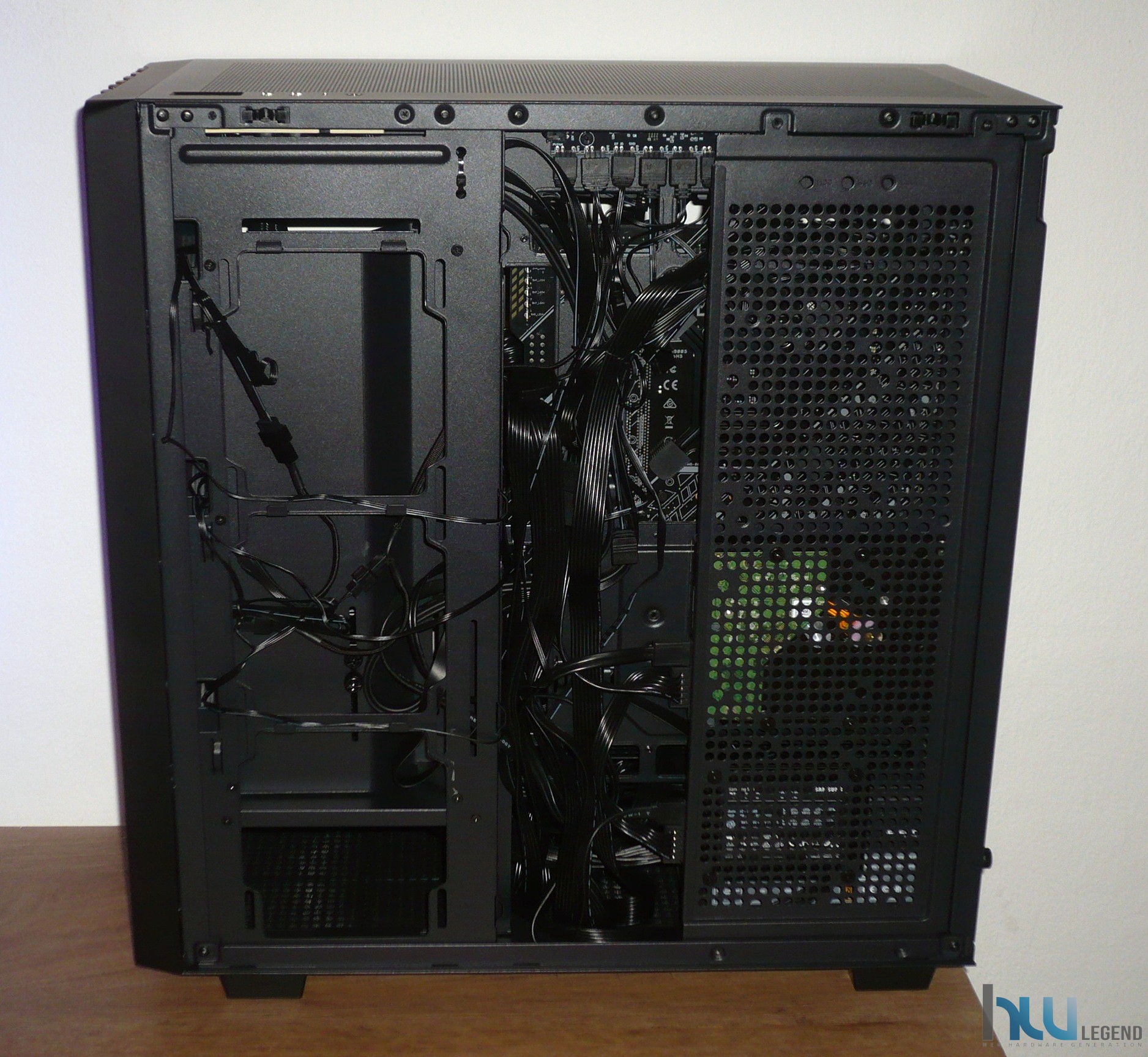 Il vano dedicato all’alloggiamento dell’alimentatore ATX (nel nostro caso uno Sharkoon REBEL P30 Gold da 1000W con certificazione 80 PLUS Gold e conforme allo ATX 3.0) mette a disposizione uno spazio indubbiamente più che buono per nascondere in maniera efficace, ed anche abbastanza ordinata, tutti i vari cavi di collegamento e di alimentazione necessari al corretto funzionamento del computer. Ovviamente nel nostro caso non abbiamo avuto il tempo necessario per un cable-management perfetto, in ogni caso il risultato ottenuto ci è parso più che soddisfacente.