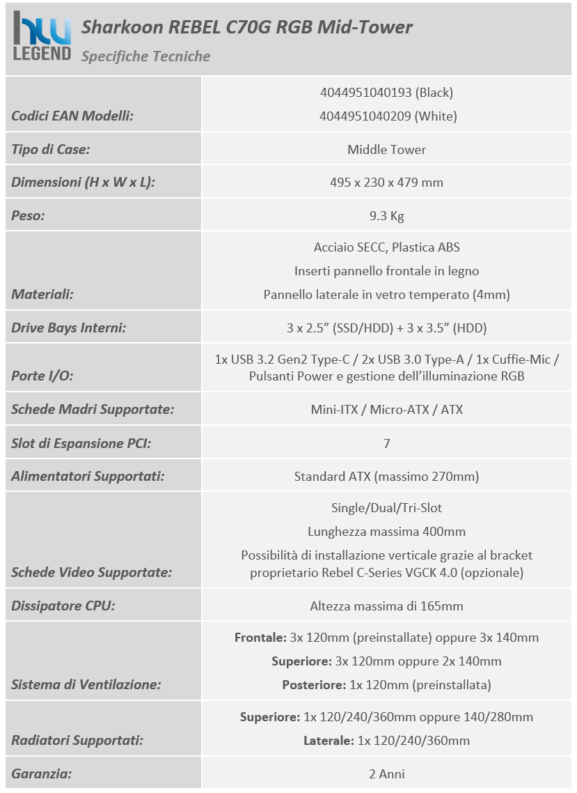 Il mercato dei cabinet per sistemi desktop è in continua evoluzione, con un’offerta sempre più diversificata allo scopo di soddisfare ogni tipo di esigenza. Tra le aziende di spicco troviamo la tedesca Sharkoon, rinomata per l’innovazione e il rapporto qualità-prezzo dei suoi prodotti. Oggi vi parliamo del nuovo REBEL C70G RGB, un interessante soluzione mid-tower che si distingue per il suo design moderno e raffinato. Un elemento distintivo è l’uso del legno nel pannello frontale, che conferisce al cabinet un tocco unico, trasformandolo in un vero e proprio complemento d’arredo, perfettamente in linea con le ultime tendenze di design. A impreziosire ulteriormente il cabinet troviamo una paratia laterale in vetro temperato, che permette di ammirare la componentistica interna e garantisce un impatto visivo di grande effetto. Lo chassis è pensato per configurazioni di fascia medio-alta, con una gestione degli spazi interni e dei flussi d’aria altamente curata. Grazie alle sue dimensioni generose, il cabinet supporta anche le schede grafiche più voluminose presenti sul mercato, diverse ventole da 120mm o 140mm per ottimizzare l’airflow, e la possibilità di integrare non solo soluzioni All-in-One, ma anche impianti a liquido di tipo tradizionale per chi cerca prestazioni superiori. Non ci resta che augurarvi una buona lettura, sperando che l’articolo sia di vostro gradimento!